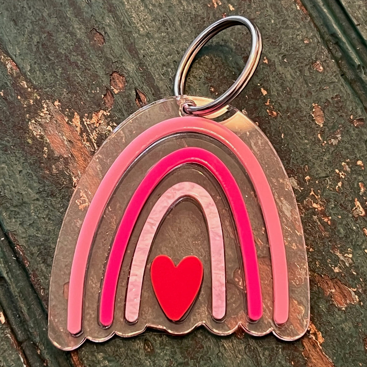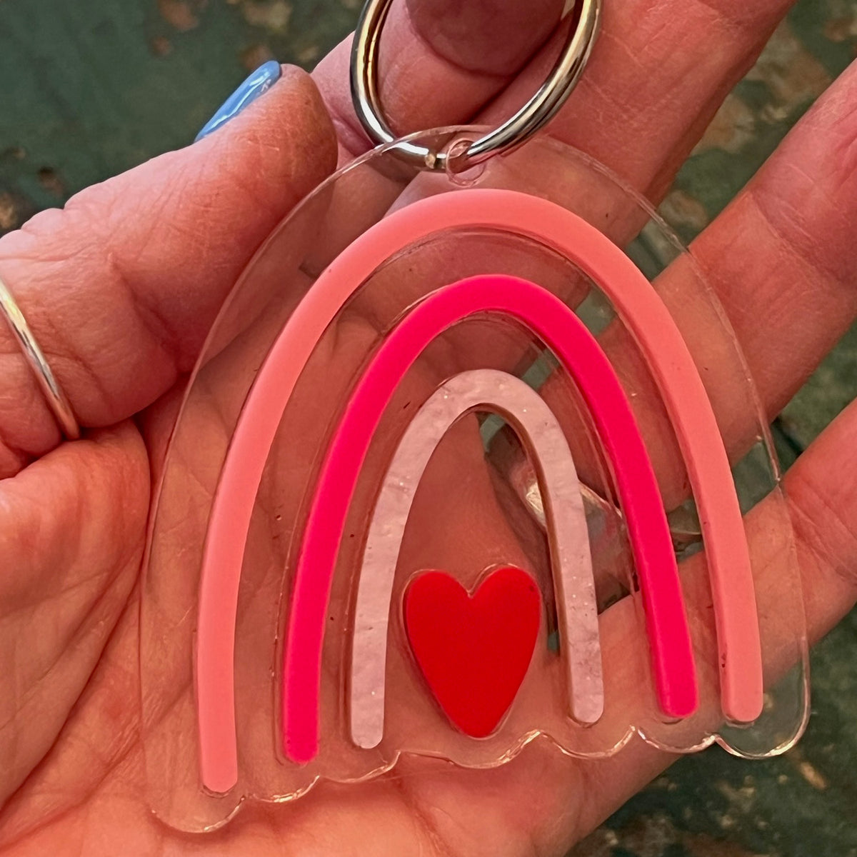 Use those acrylic scraps to make a fun 3D rainbow keychain. The design is scored on the clear acrylic backing to help lay out the arches. Use scrap colors to make the arches and attach them with 3M tape. Each arch and heart can be cut separately.