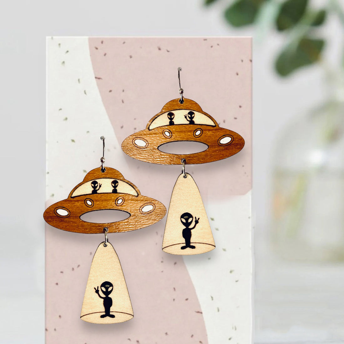 Embrace the fun, out-of-this-world Alien Earrings,' featuring a unique Beam Me Up charm. Their unique design guarantees the perfect gift for the galactic enthusiast in your life or as an intriguing addition to your wine glass as a charm.