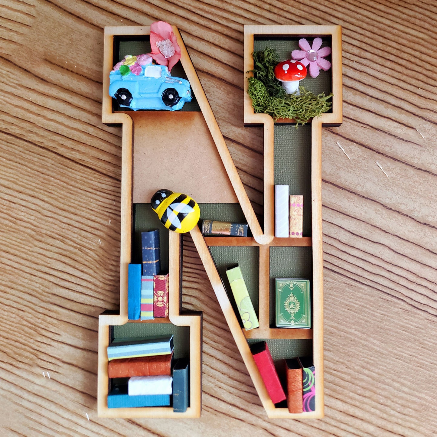 This laser cut mini bookshelf is fun for any book lover! There are so many ways to customize and create to your liking. You can choose from various styles and sizes of wood, plus there are so many opportunities to create and add your own special touches and mini figures.