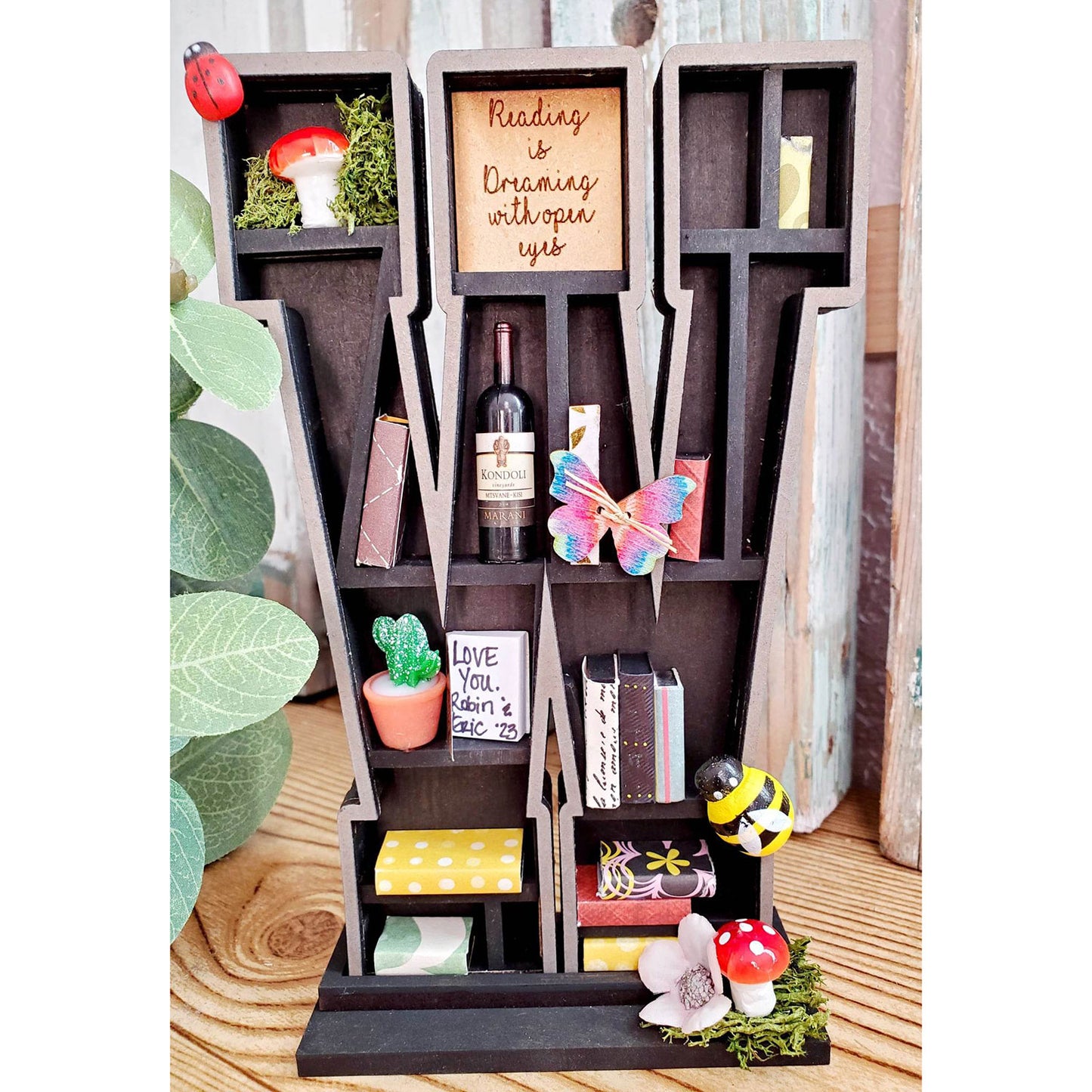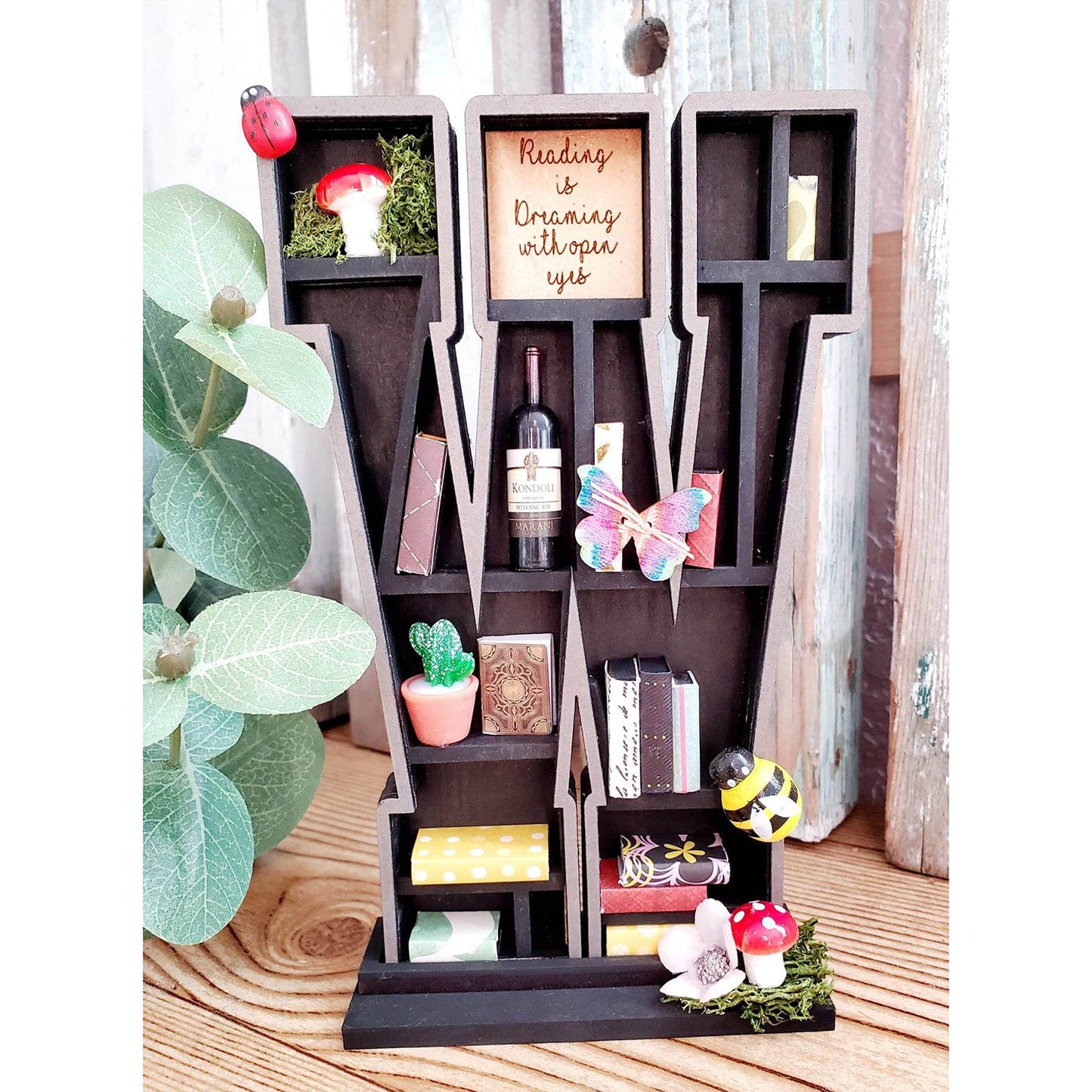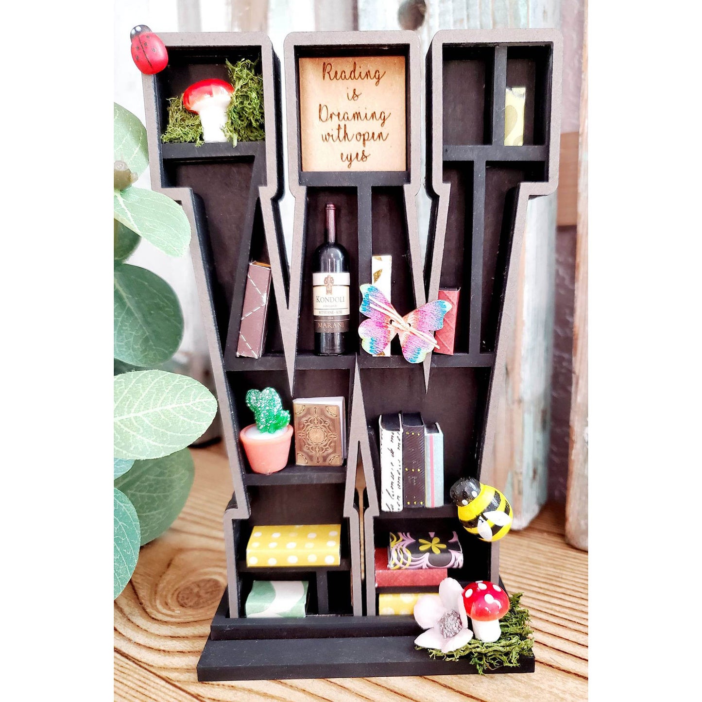 This laser cut mini bookshelf is fun for any book lover! There are so many ways to customize and create to your liking. You can choose from various styles and sizes of wood, plus there are so many opportunities to create and add your own special touches and mini figures.