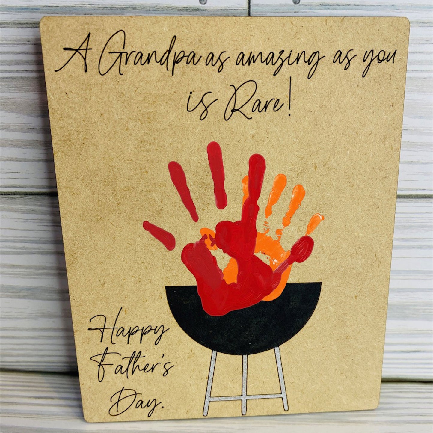 How adorable is this unique handprint grill sign for laser cutting?! Great gift for Father's Day! (You can also remove the happy fathers day and customize it more) Get creative and use different colors for the handprints (red, yellow, orange) Add names to the other side of the grill to make it personal. Fast laser cut. Score lines are provided for grill so it's easier to paint or leave it blank if you want. Need another title such as Grandfather, Pop Pop, Papa, or Dad? Check out my other versions in the catalog.