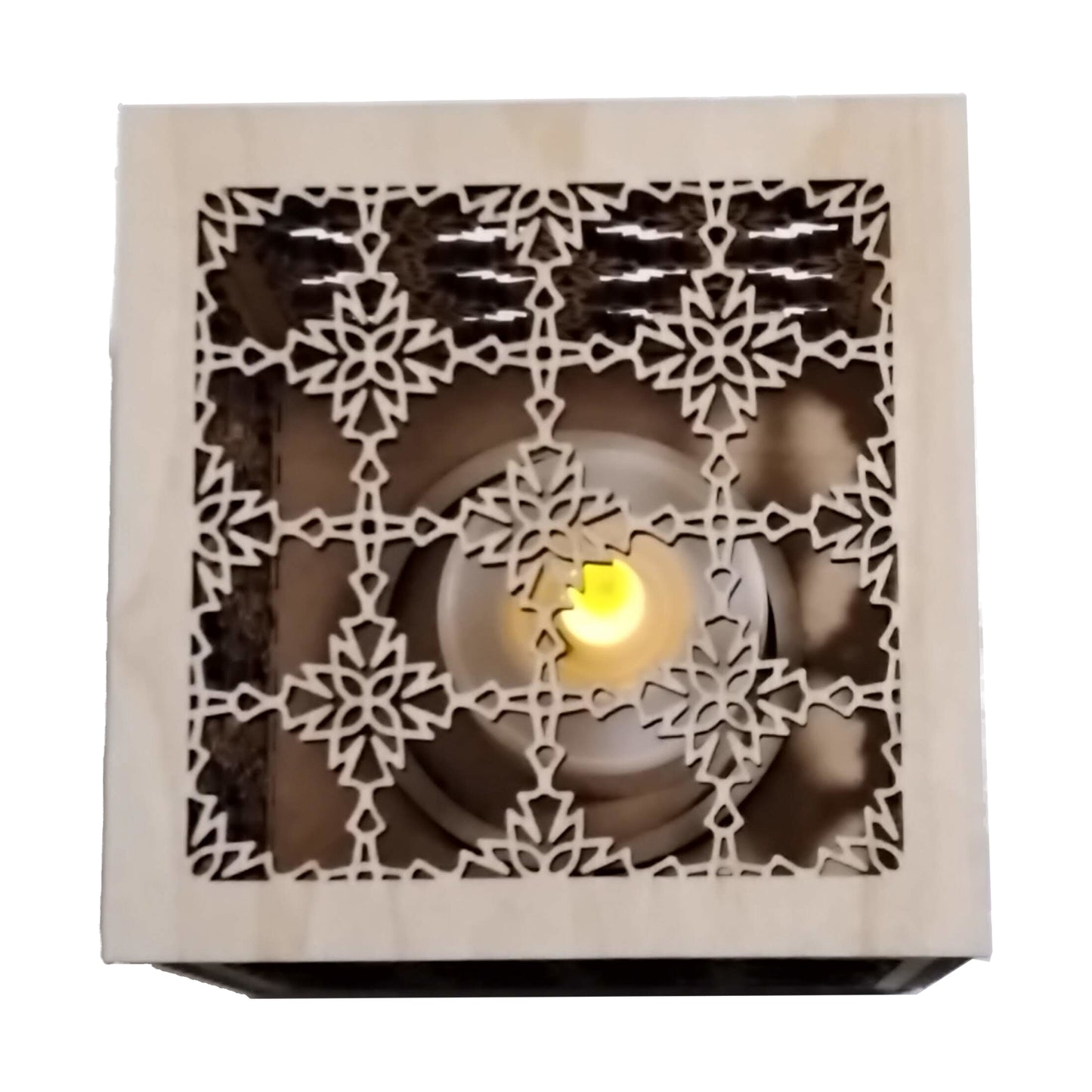 This intricate light enclosure holds smaller LED tealights to add a warm glow to your bedroom, coffee table, breakfast table, or many tables like in a restaurant or gathering. This filigree pattern of arrow theme is one of many such patterns to choose from. It is very open so light can easily pass through and the lid will cast a pattern on the ceiling. This design is perfect for laser cutting.