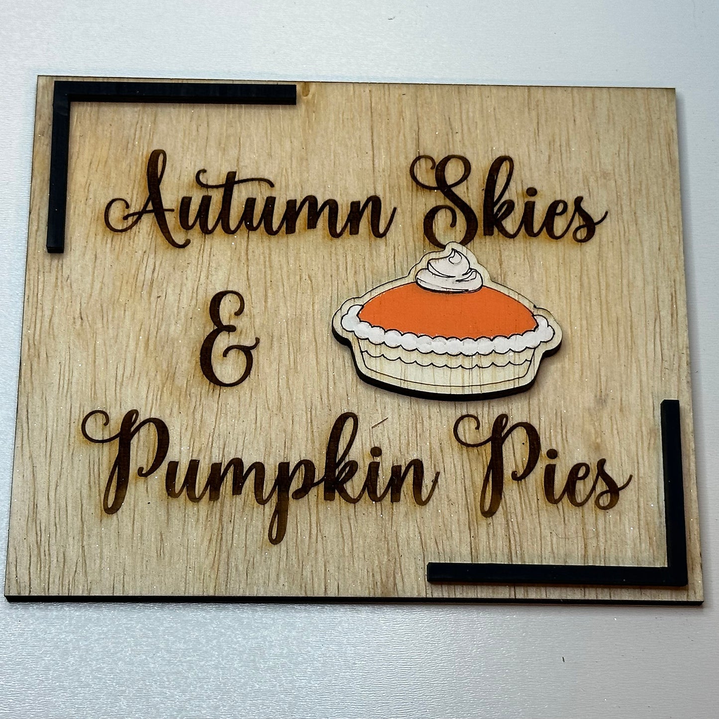 Embrace the coziness of autumn with this "Autumn Skies and Pumpkin Pies" sign. Perfect for adding a warm and inviting touch to your home.