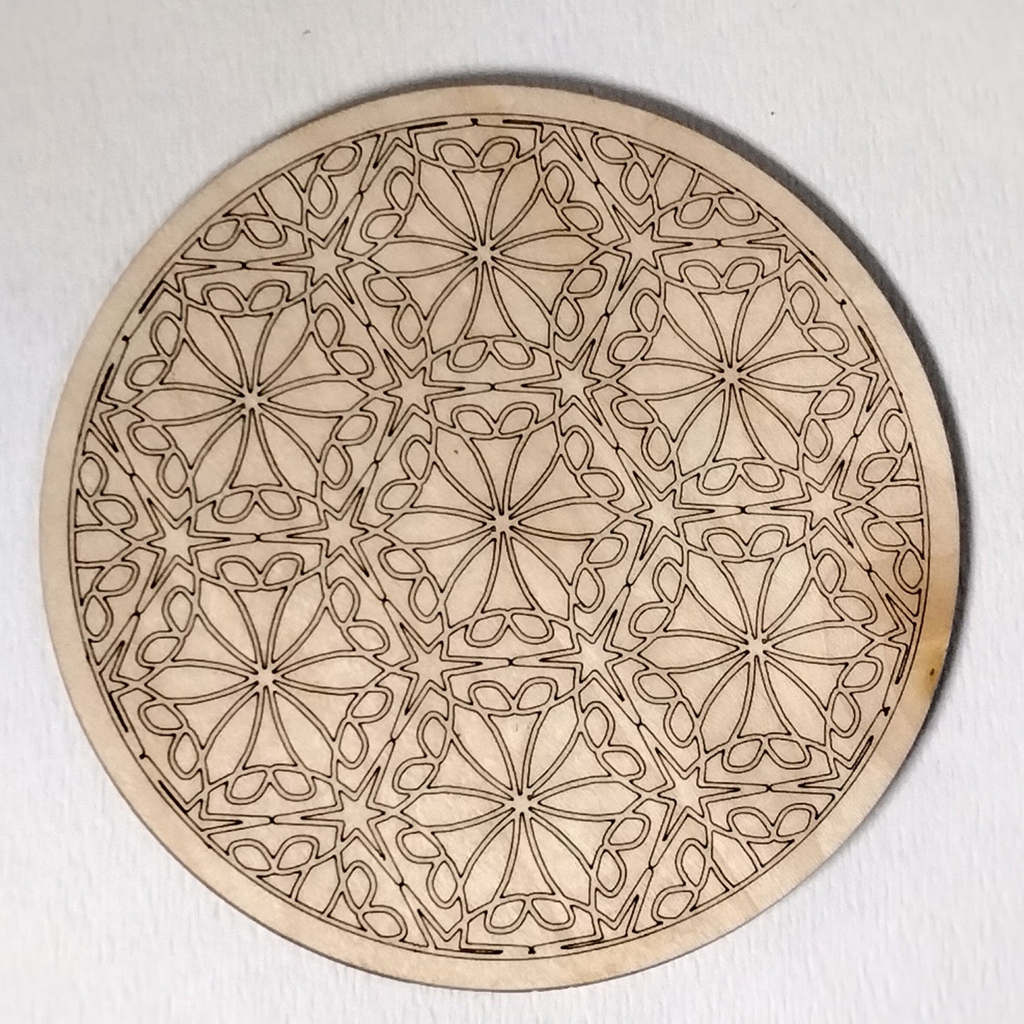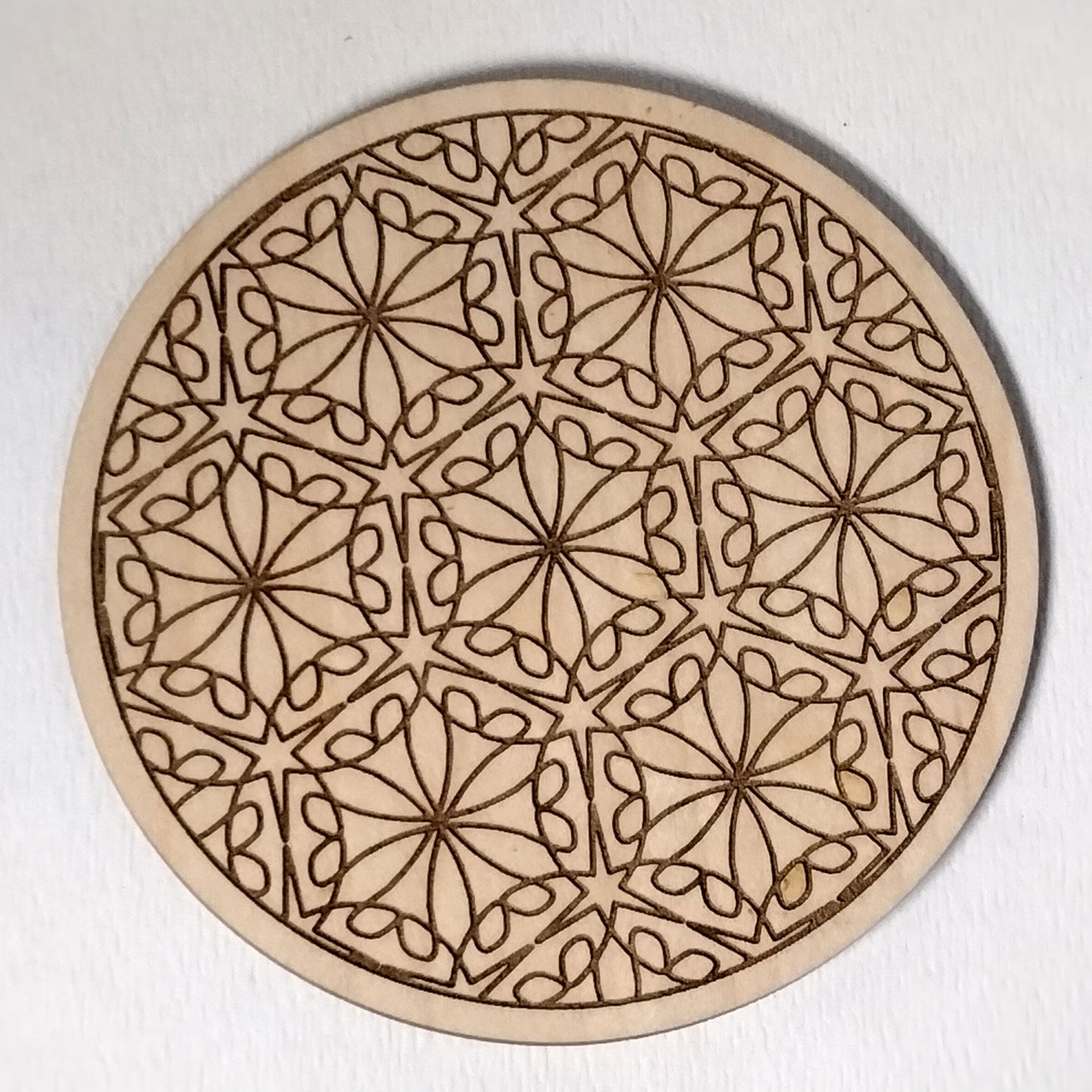 A beautiful geometric display of seven Morning Glory flowers with stars and leaves about, perfect for laser cutting. Two variants are possible. Make the engraving as laid out or set that part to score for a more delicate look and half the time. Either way an excellent base for your morning coffee. Use an optional round cork backing to make it sit more securely.