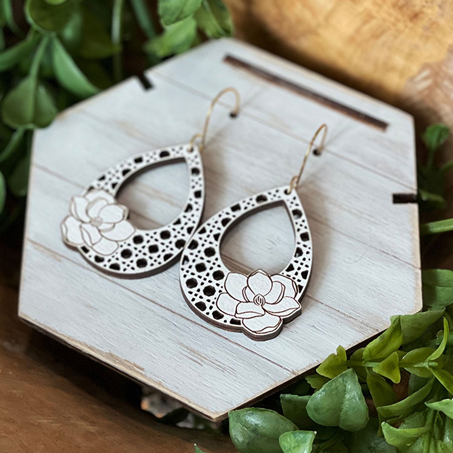 These earrings are easy to laser cut and create for a quick gift for selling. These Boho Rattan Magnolia Earrings are the perfect accessory for your next festival or gypsy, or hippie party.