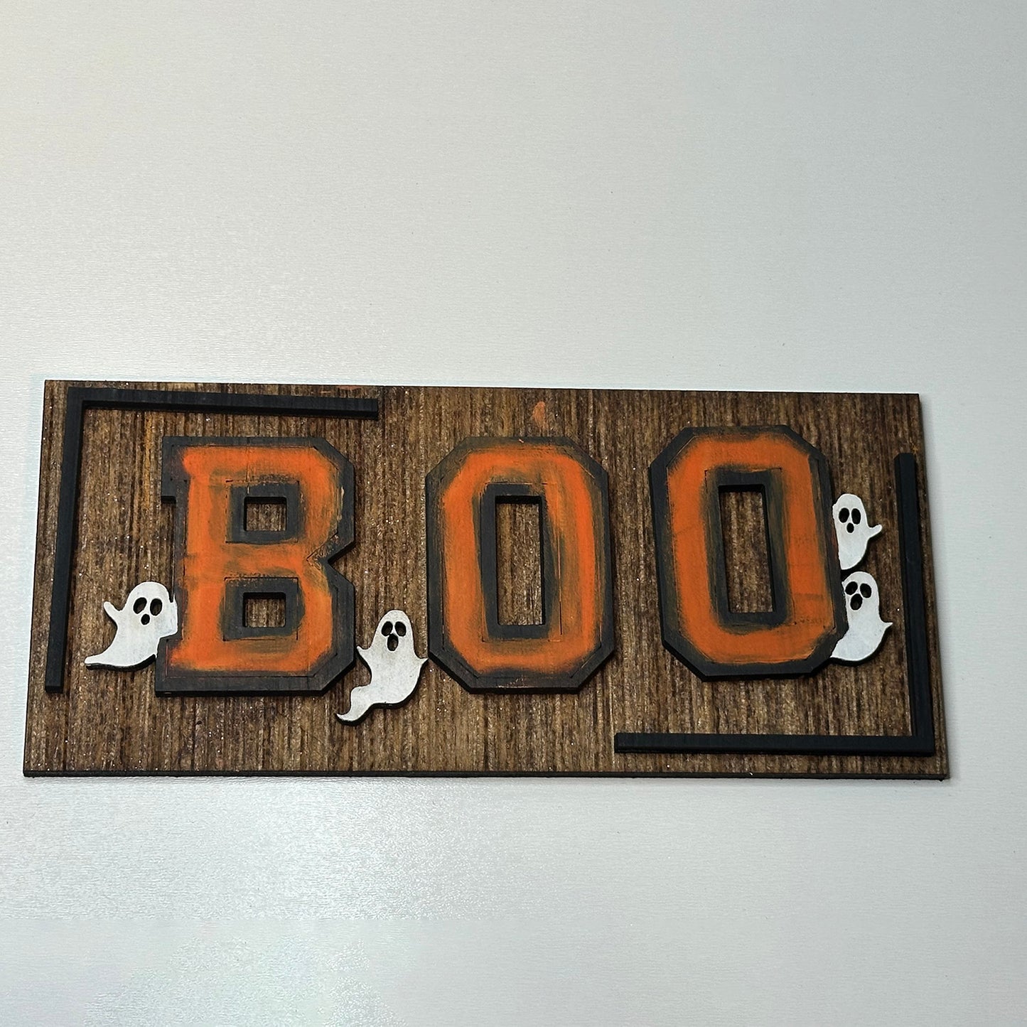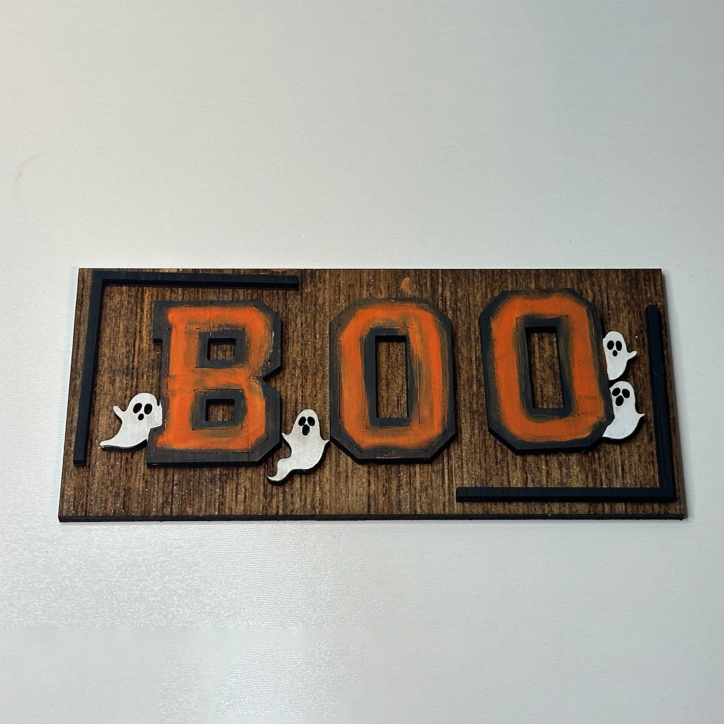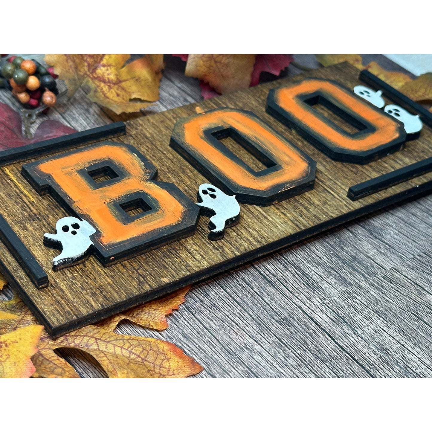 Get into the Halloween spirit with this "BOO" sign featuring ghostly characters. Perfect for door or wall decorations to make your home festive and fun.