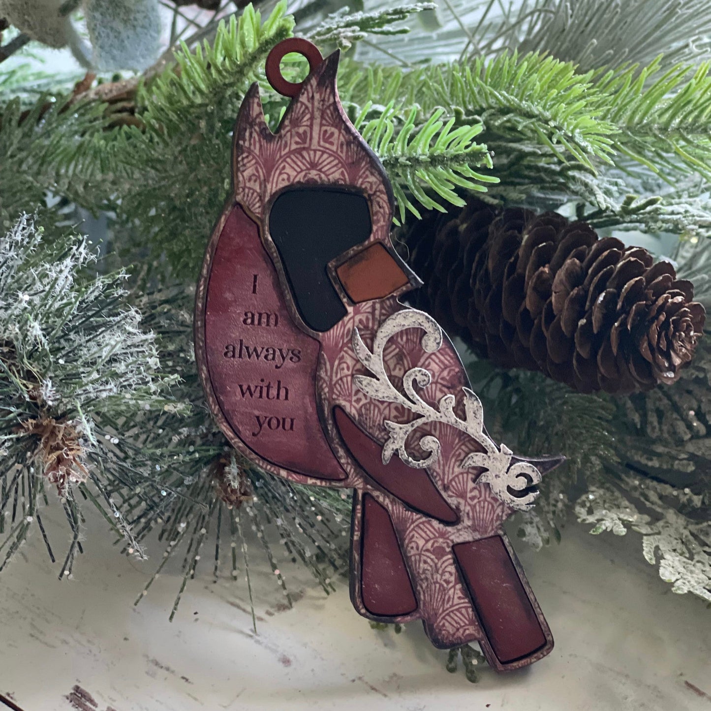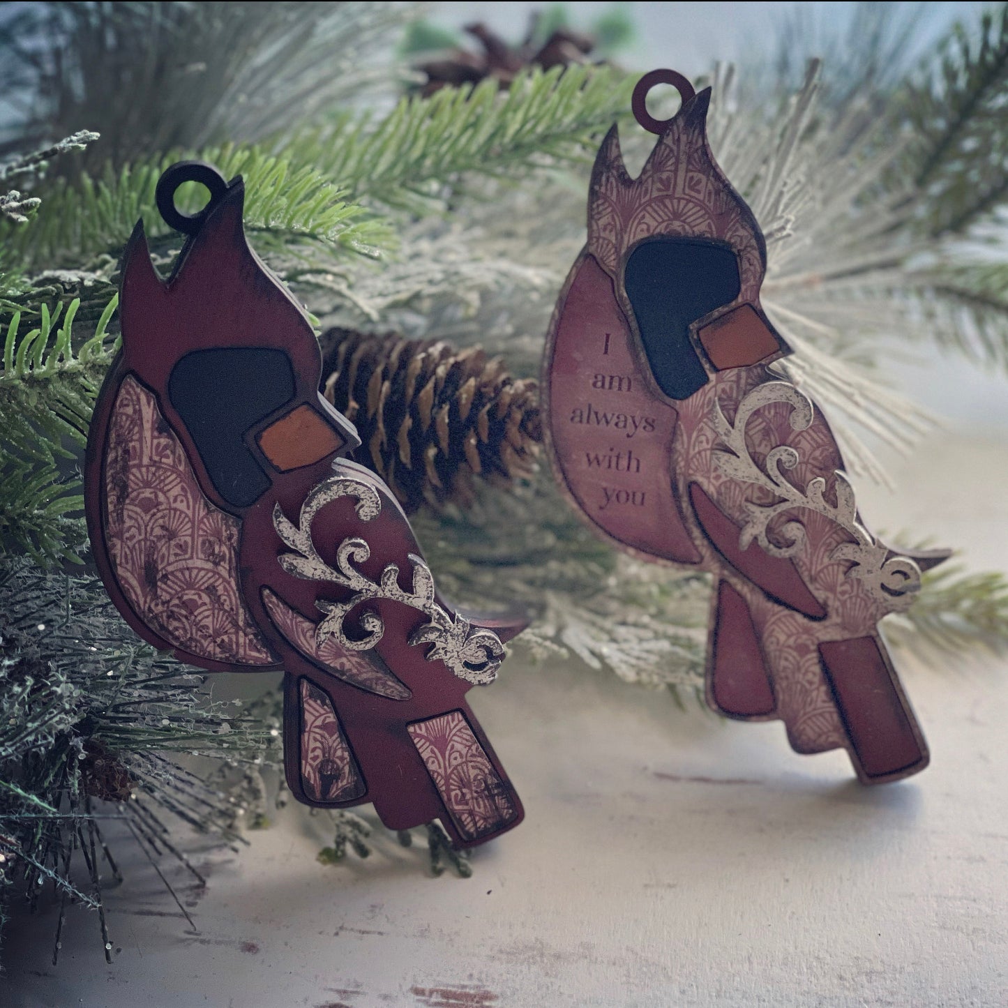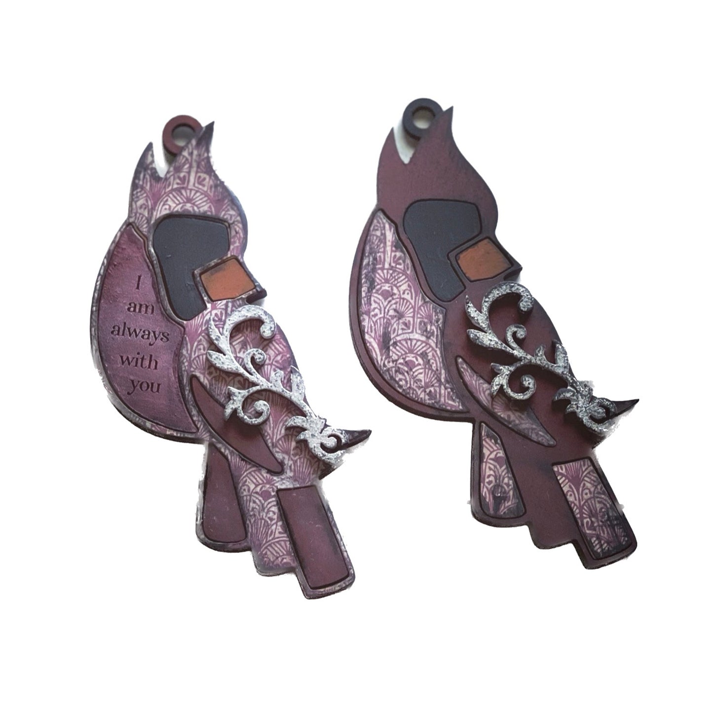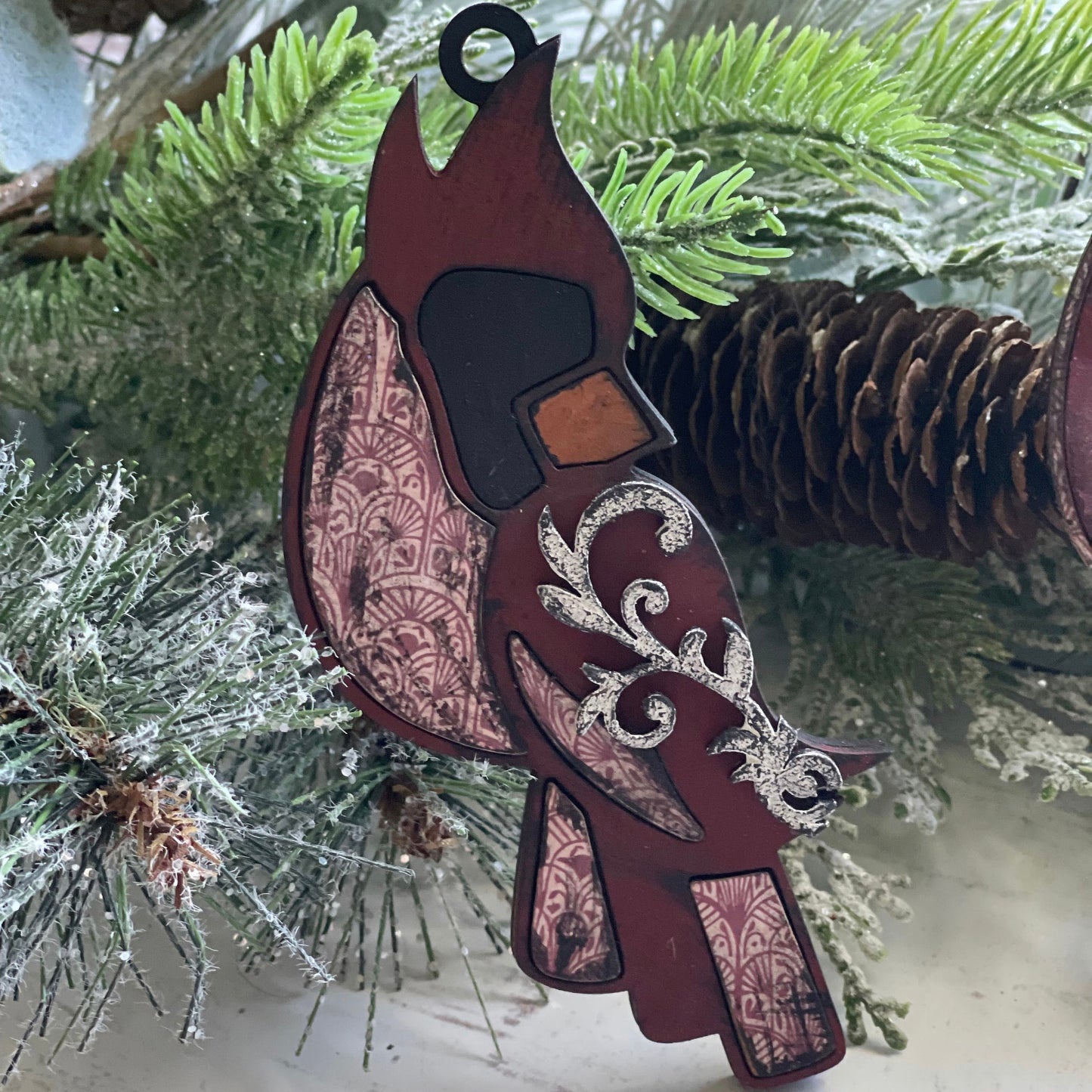 A beautiful way to remember someone special this holiday season is with these stunning cardinal ornaments that can be personalized and laser cut. Cut with proof grade medium draft board and finished with chalk paint and scrapbook paper and distressed with stamp pads along the edges. Card stock and scrapbook paper can be laser cut on your Glowforge to add some real beauty to your projects. Adhere your scrapbook paper with 50/50 white glue and water mix before applying and afterward for a smooth finish. These make beautiful gifts, DIY kits, a paint night party idea, or something nice to add to your small business.