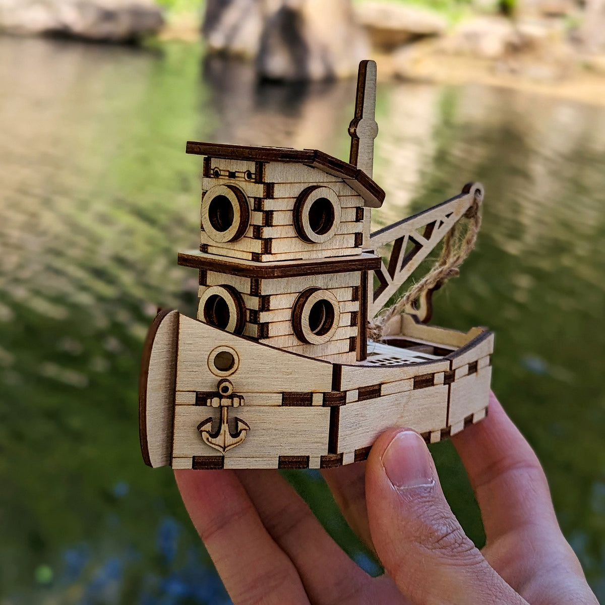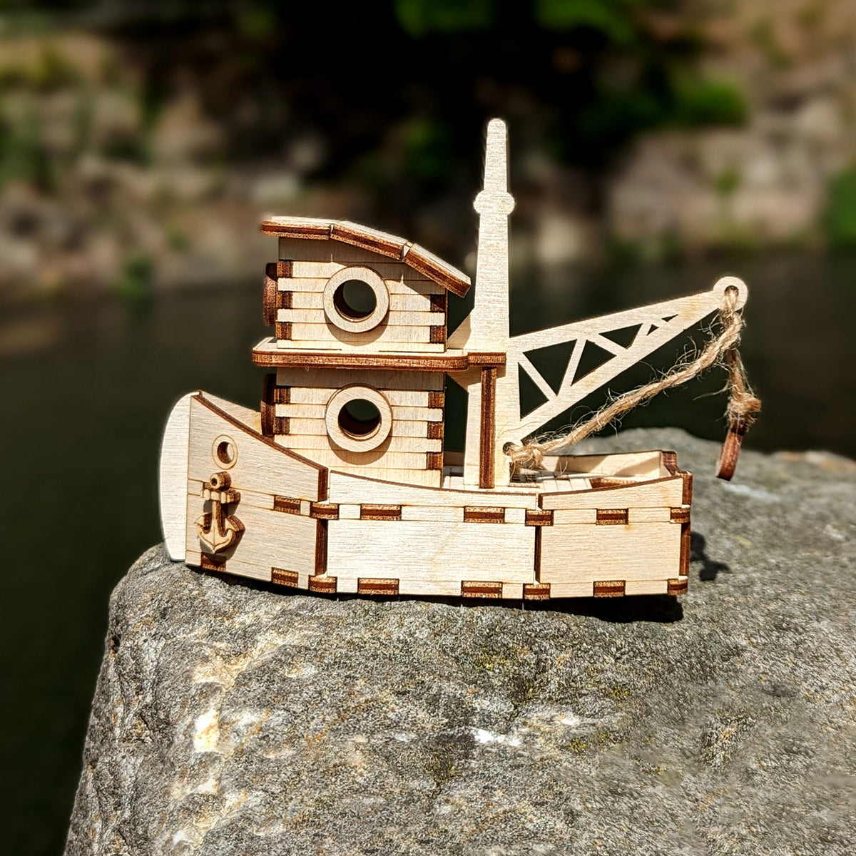 Discover the whimsical world of laser-cut designs with this cartoon-styled Fishing Boat project! This ship has details such as a cabin, a cargo hold, and even small lifebuoys and an anchor.