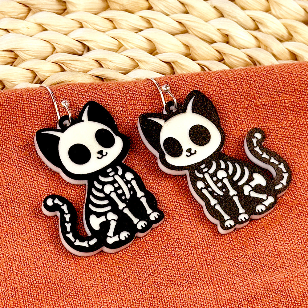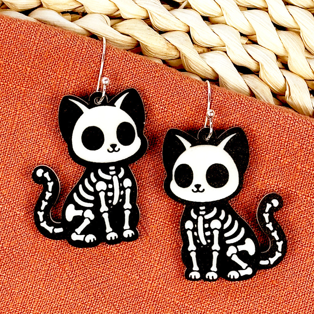 Bring a spooky yet cute vibe to your Halloween accessories with these Cat Skeleton Halloween Earrings. Featuring an adorable skeletal cat design, these laser-cut wood earrings are perfect for cat lovers and Halloween enthusiasts. Ideal for Halloween parties, fall events, or as a unique and fun gift.