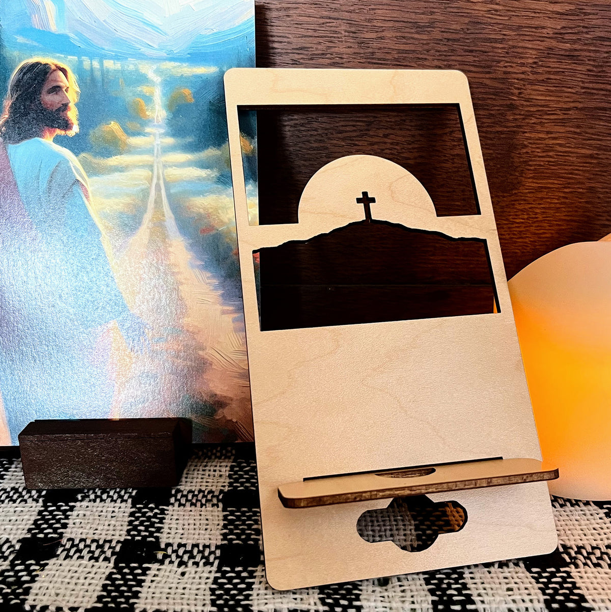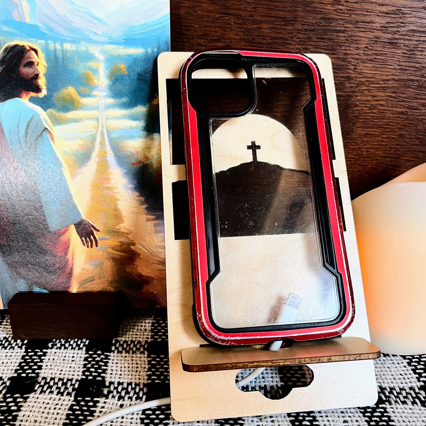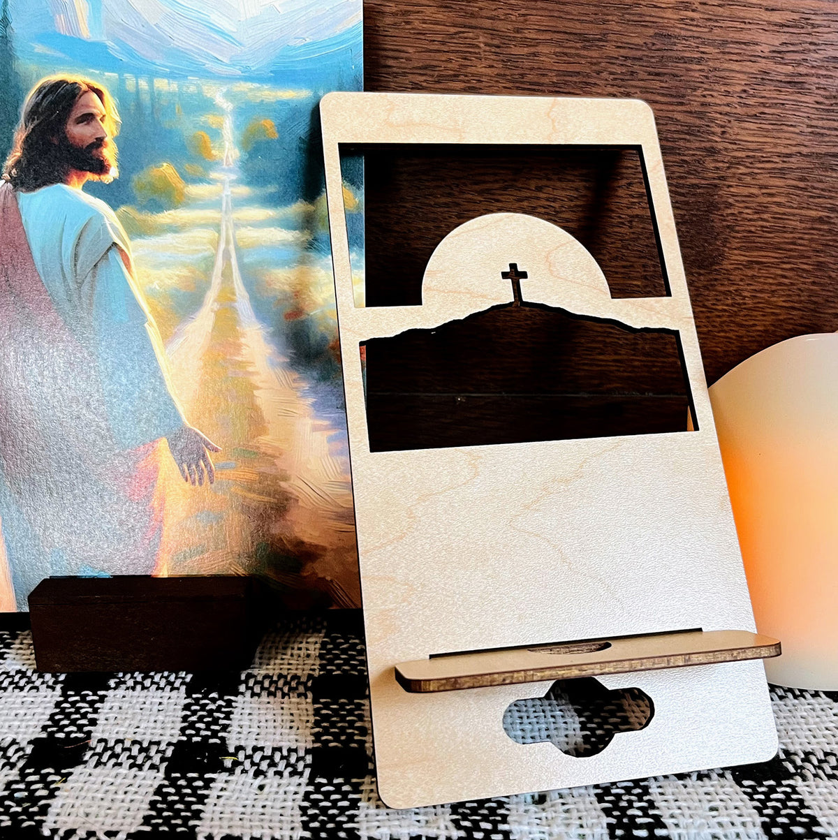 Embrace your faith and functionality with the Christian Cross Phone Stand, a beautifully crafted wooden accessory that symbolizes spirituality and utility. This stand features a striking cutout design of a hill with a Christian cross atop it, creating a meaningful visual representation of devotion and light. Perfect for securely holding phones of various sizes, this stand combines practicality with an uplifting aesthetic that fits seamlessly into any workspace or home decor.