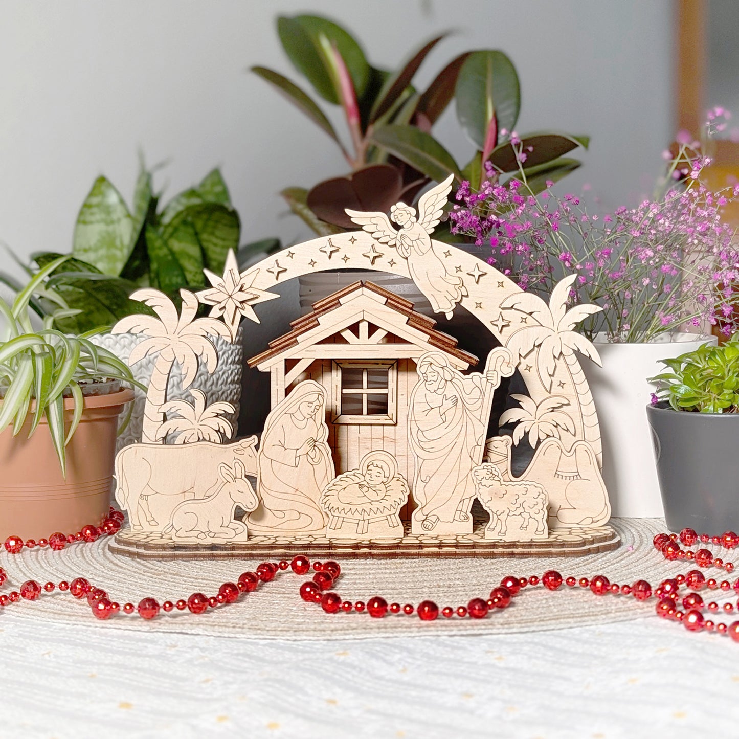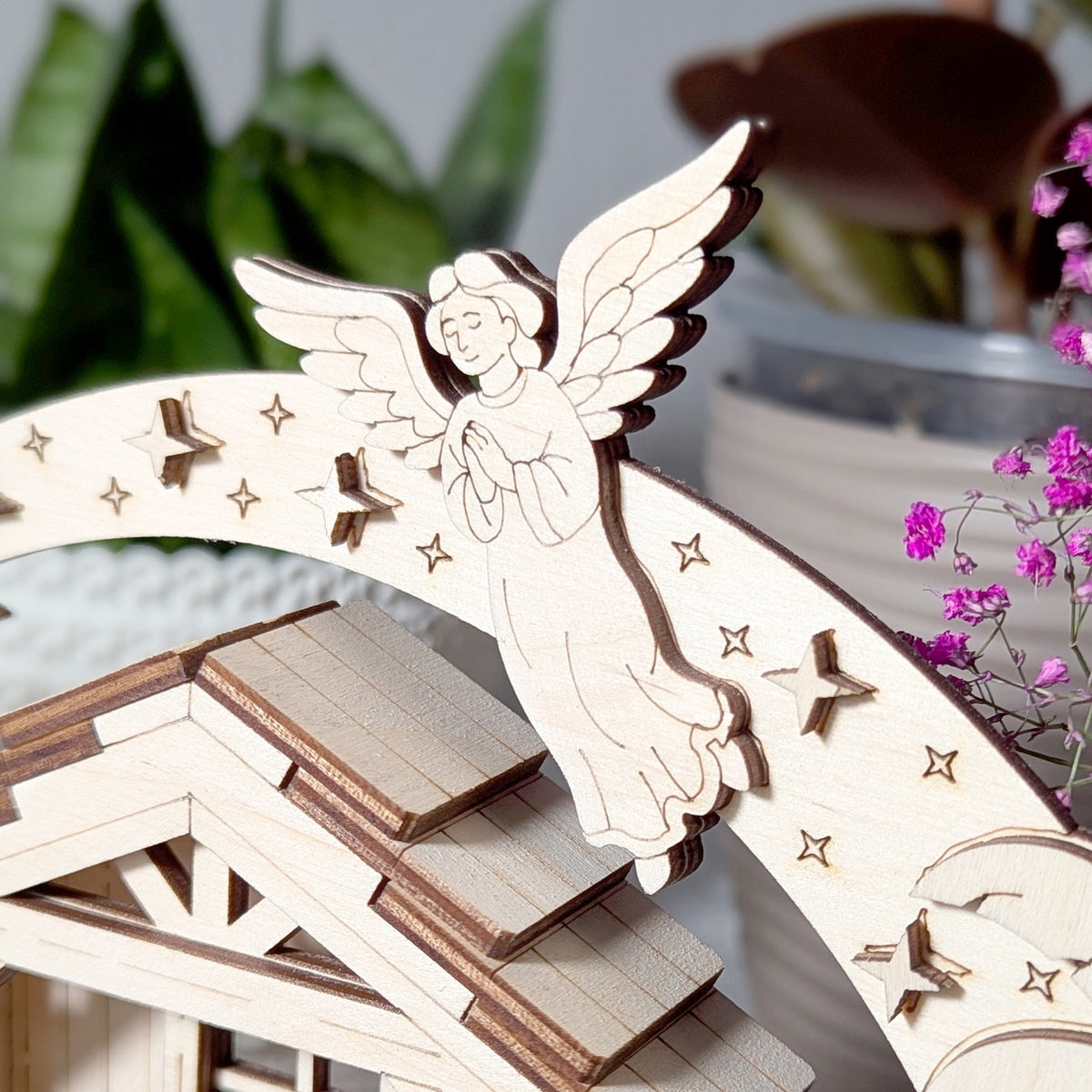 A beautifully detailed Christmas arch featuring the Nativity scene with the Holy Family, a watching angel, gentle animals, and the Star of Bethlehem above. Perfect for mantels, windowsills, or holiday displays. A meaningful centerpiece for traditional Christmas decor and faith-filled celebrations.