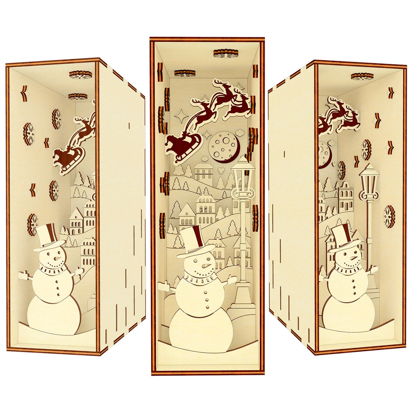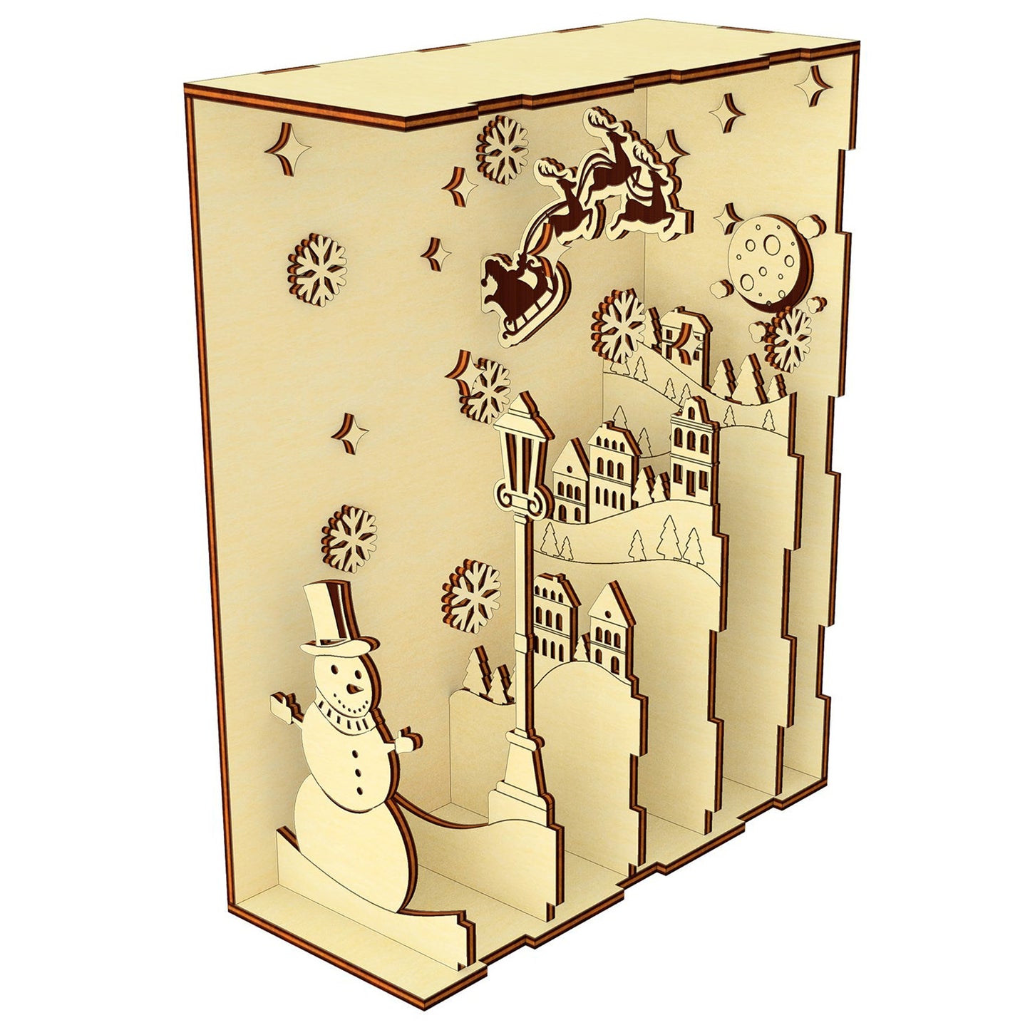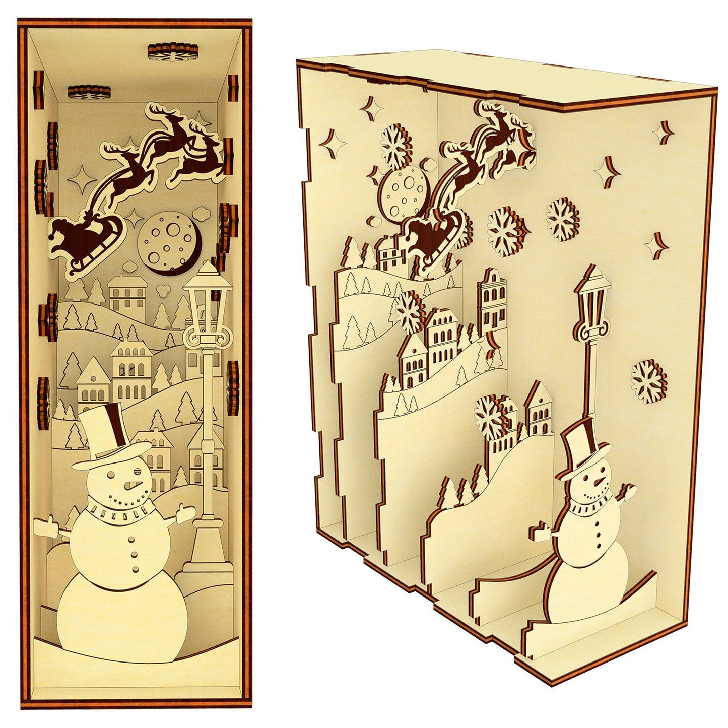 Welcome to the Christmas Book Nook, where the magic of the holiday season comes alive in a captivating winter scene. This enchanting nook features a charming tableau complete with a cheerful snowman, jolly Santa Claus with reindeer on the background, twinkling moon, and an old city nestled under a blanket of snow. Crafted with intricate detail and festive flair, it beckons you into a world of wonder and joy. Whether displayed on a bookshelf, mantle, or as a centerpiece for your holiday decor, this Christmas Book Nook evokes the warmth and nostalgia of cherished holiday memories.