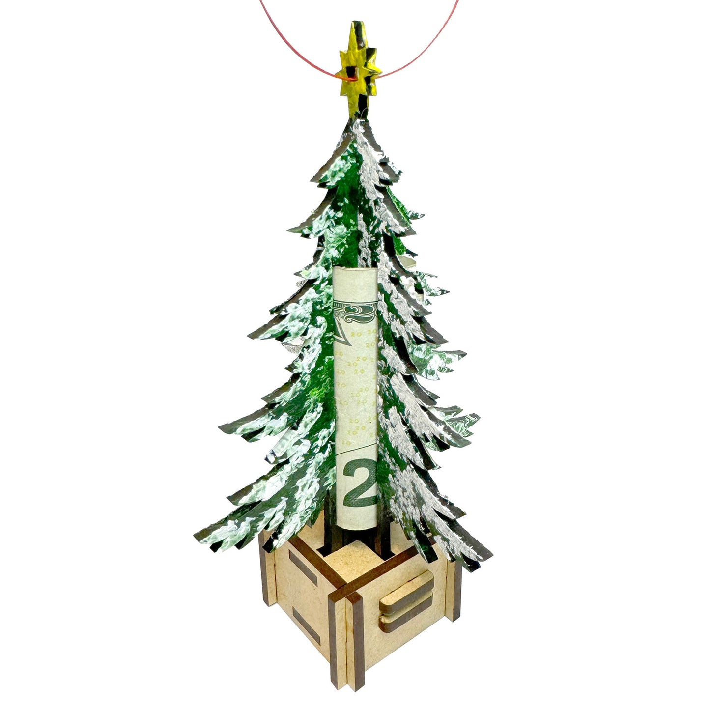 The perfect gift for the puzzler in your life. This laser cut Christmas tree ornament holds the perfect gift, money. It's there in easy view, but not so easy to get to. The base of the tree is a fairly easy puzzle box that will release the money with the right combination. You set the combination and can change it each time if desired. 16 possible solutions, the trick is remembering what you tried on each side. This version is created for use with Medium Draftboard or plywood. Medium Acrylics might want to try the Aura Version for smaller slots.