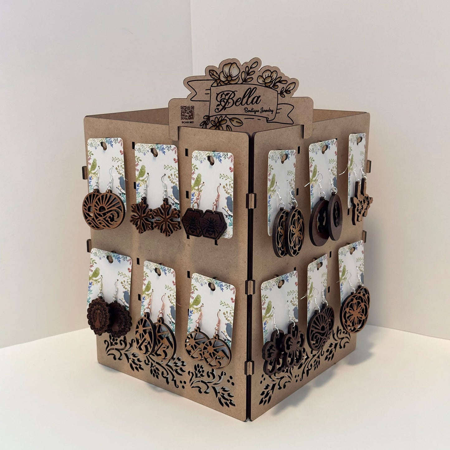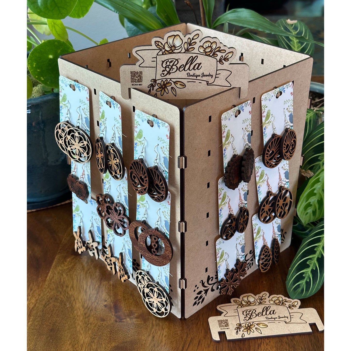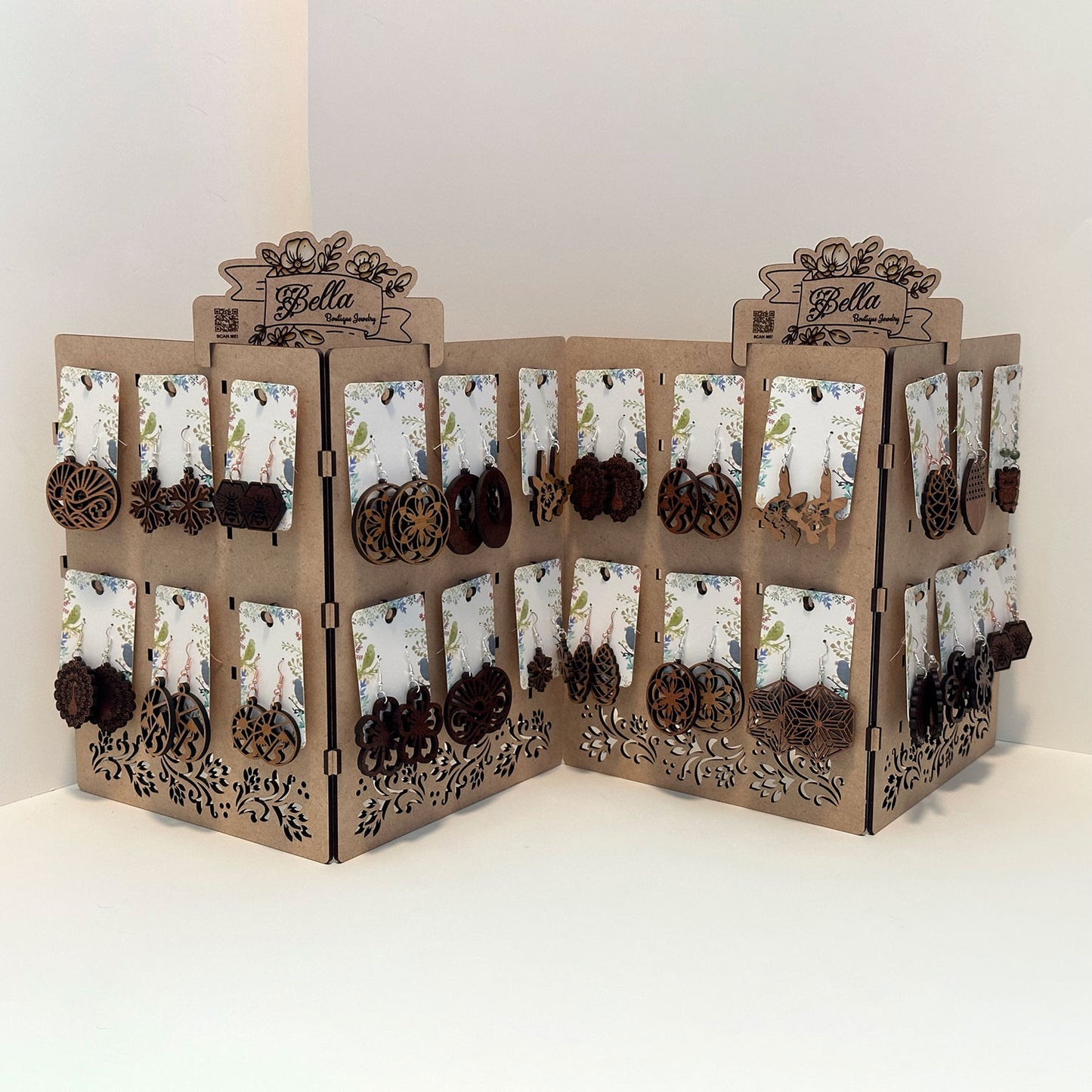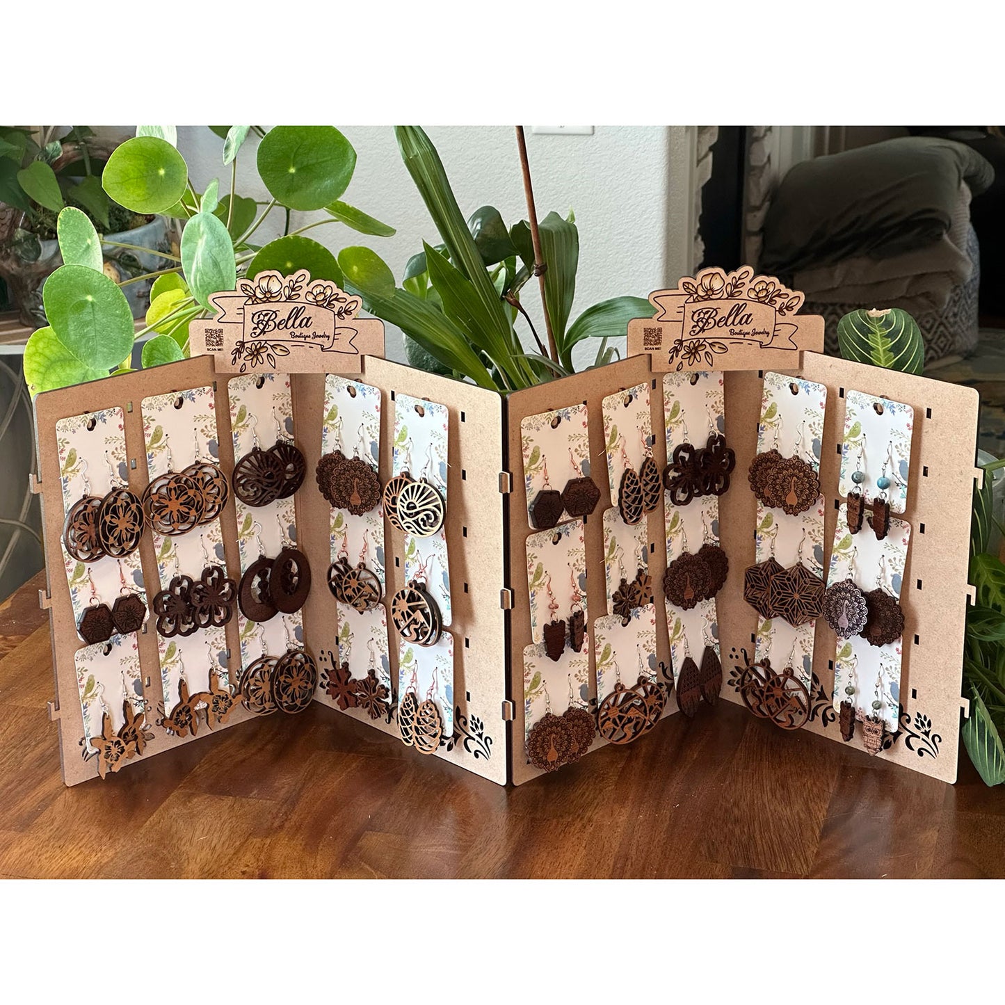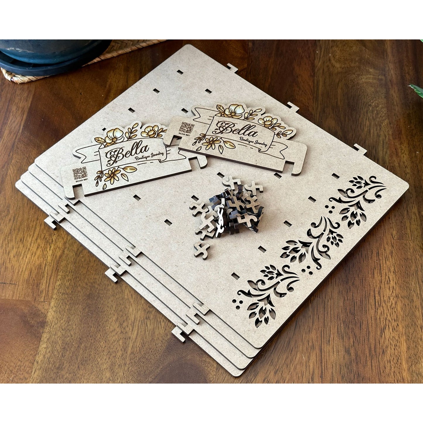 This cleanly designed "pegboard-style" jewelry display is perfect for laser cutting and is just what you need to display and sell your earrings or other jewelry. Great for showing off your designs at fairs, flea markets, or a storefront! The panels interlock to form a 360-view square or a more open "W" style. With the “W” style, you can make it as wide as you want. The peg arrangement can be configured to make the best use of space for different product sizes. And you can make the design your own with the easily customizable interlocking sign. And the best part is you can store and transport it all flat when disassembled.