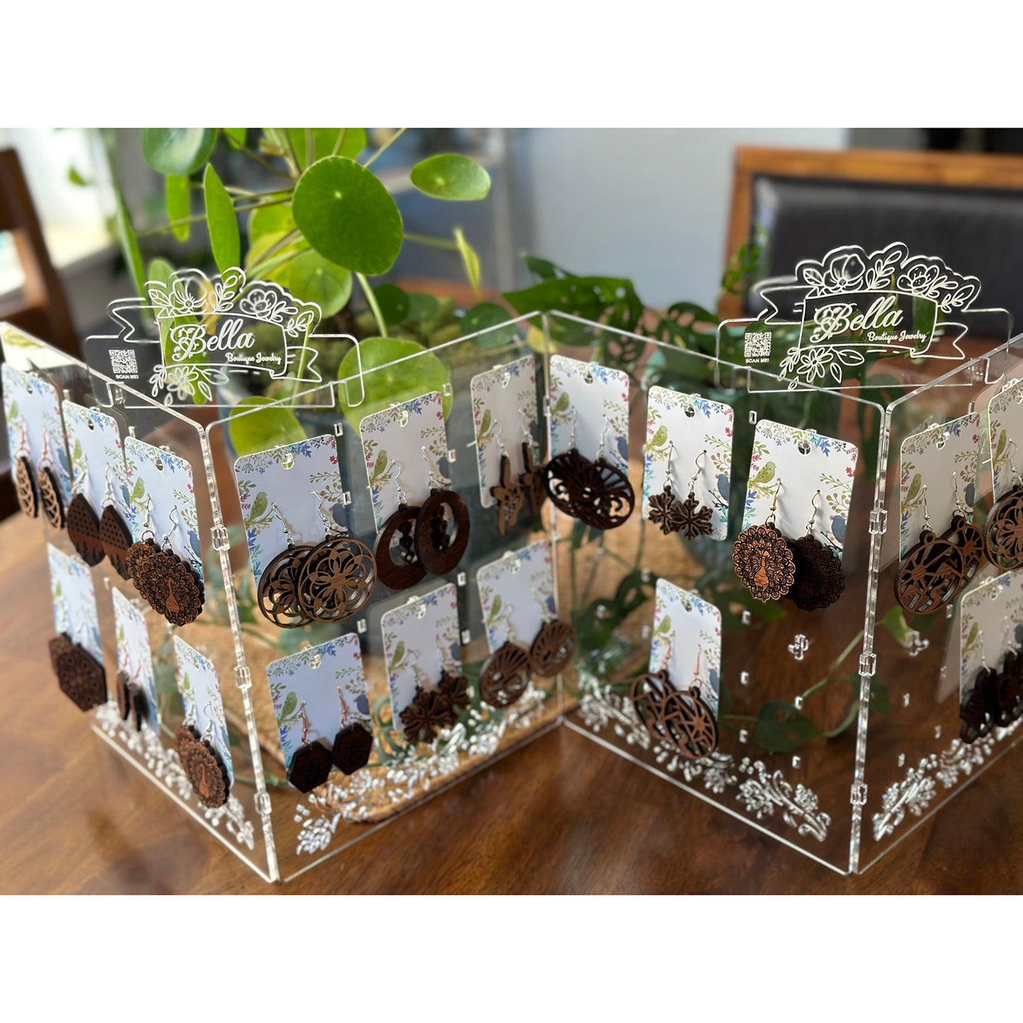 This cleanly designed "pegboard-style" jewelry display is perfect for laser cutting and is just what you need to display and sell your earrings or other jewelry! Great for showing off your designs at fairs, flea-markets, or a storefront. The panels interlock to form a 360-view square or a more open "W" style. With the “W” style, you can make it as wide as you want! The peg arrangement can be configured to make the best use of space for different product sizes. And you can make the design your own with the easily customizable interlocking sign. And the best part, is you can store and transport it all flat when disassembled.