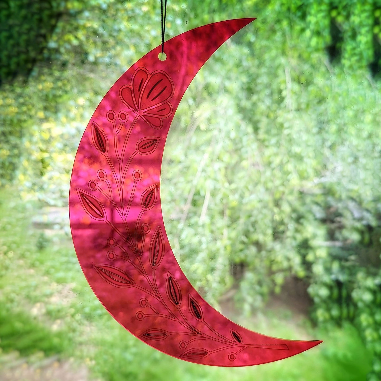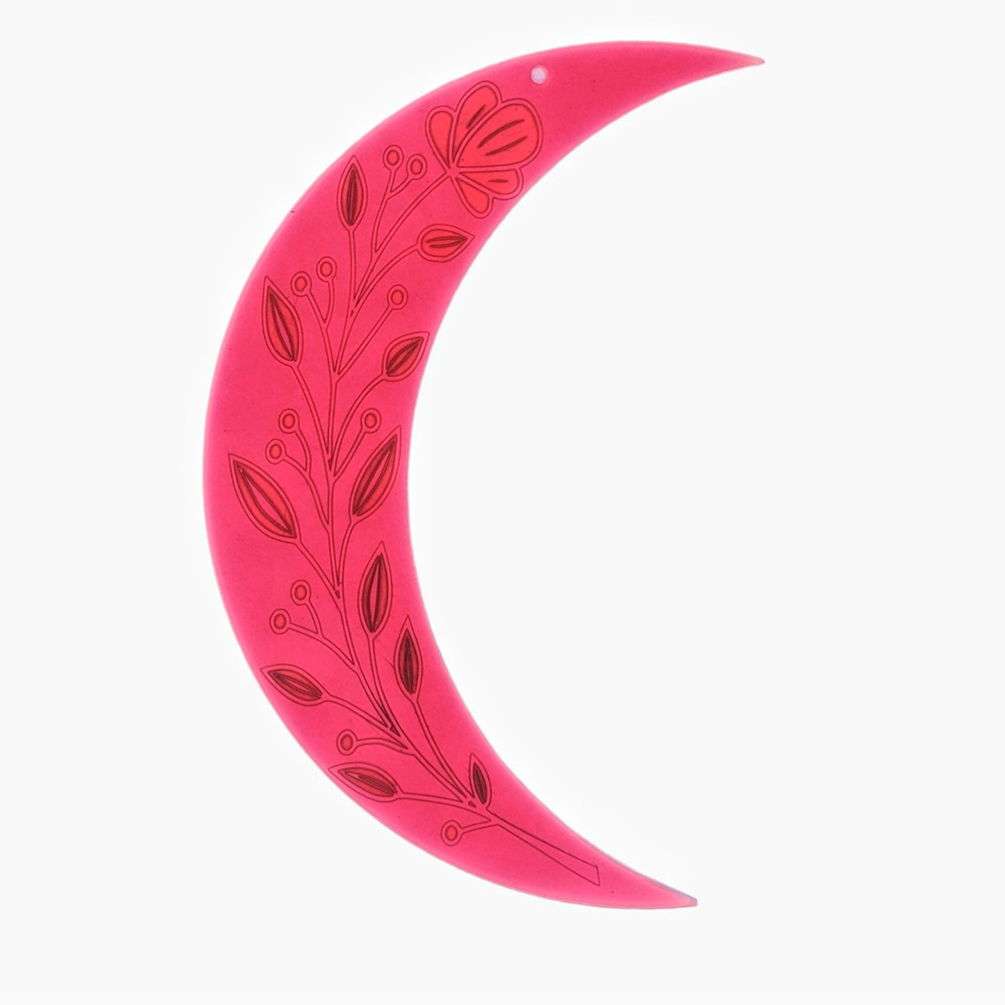 Enjoy the light of a neon moon any time by hanging this pretty floral crescent moon suncatcher in your window. Score the flower design for laser cutting to have it done in no time. Fill with paint for more contrast before unmasking. 10.5 inches tall as is, or resize however you like to make it an ornament or whole sheet.