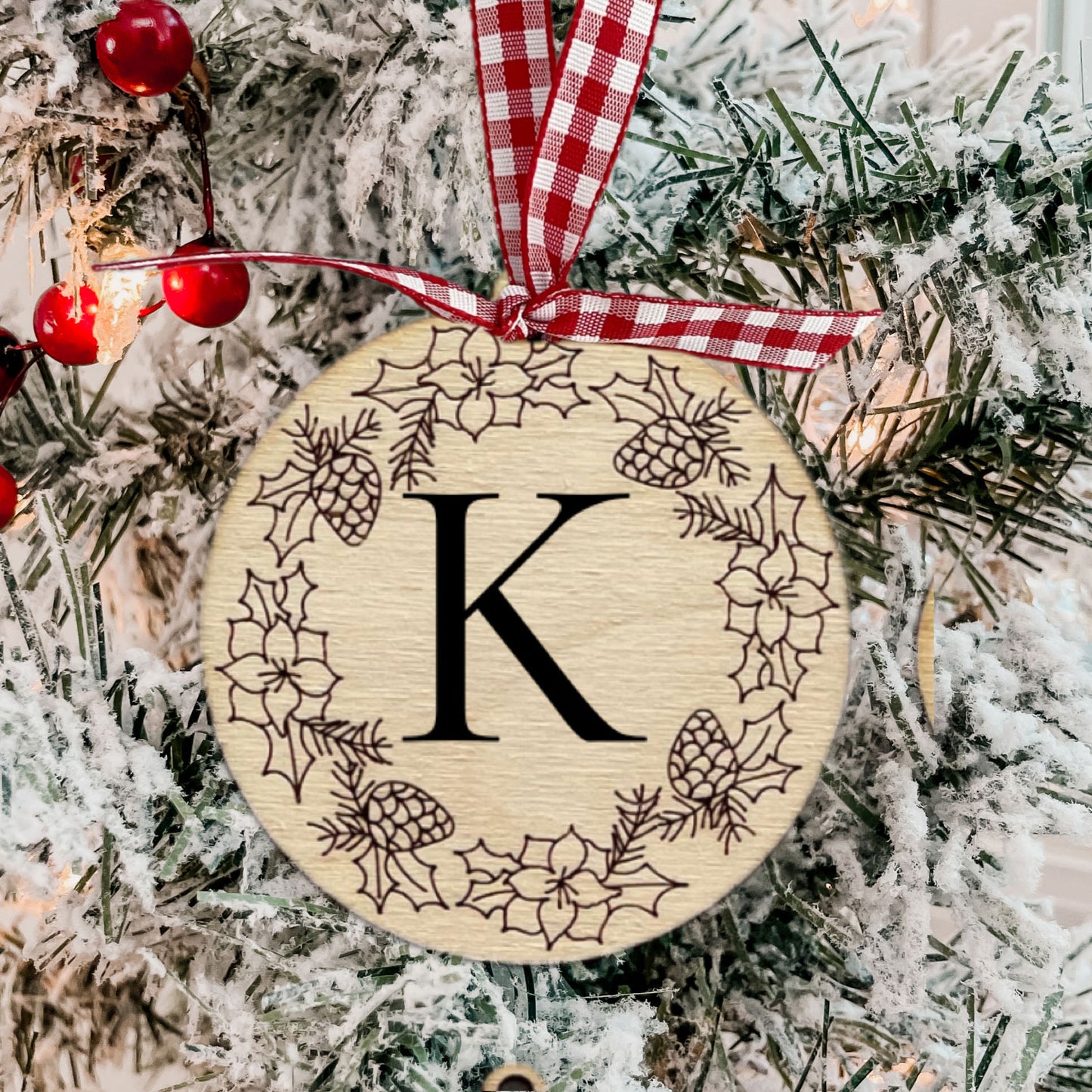 This laser cut design is perfect for customization. Add a letter or a name to the center of the ornament and give it as a gift. The poinsettia and pinecone design are SCORED. The letter added to the center of the laser cut ornament is EB Garamond from the text Library. You can use any font you want though to make it your own.