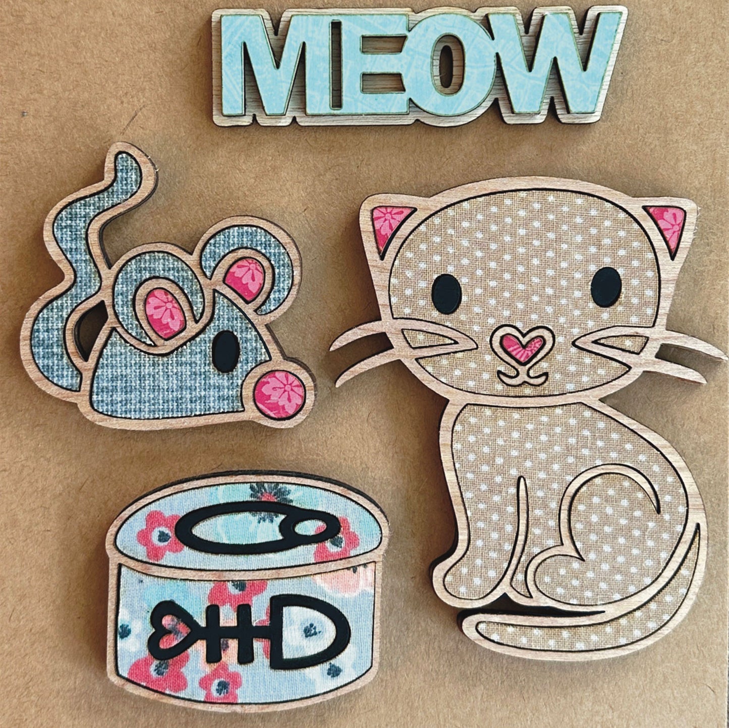 This set of laser cut cat-themed magnets makes such a cute and functional addition to your refrigerator or office decor. With hand-drawn artwork, this set features four magnet pieces: cat, mouse, tuna can, and "meow" wording, with a top and bottom layer to each element. Instructions are included for using papers or fabrics on your inlaid pieces, or you can simply paint them, or just use the top and bottom layers with no inner pieces at all. There are numerous ways to create different looks with these magnets.