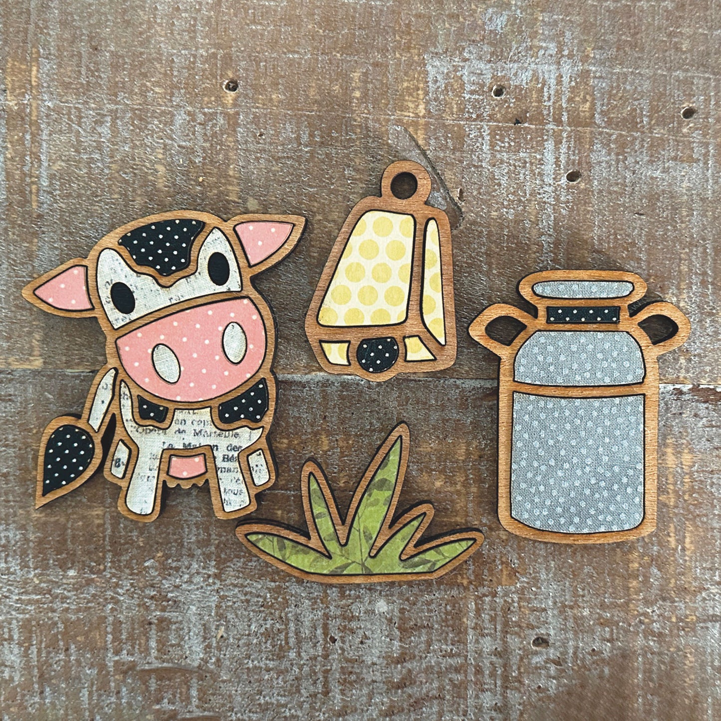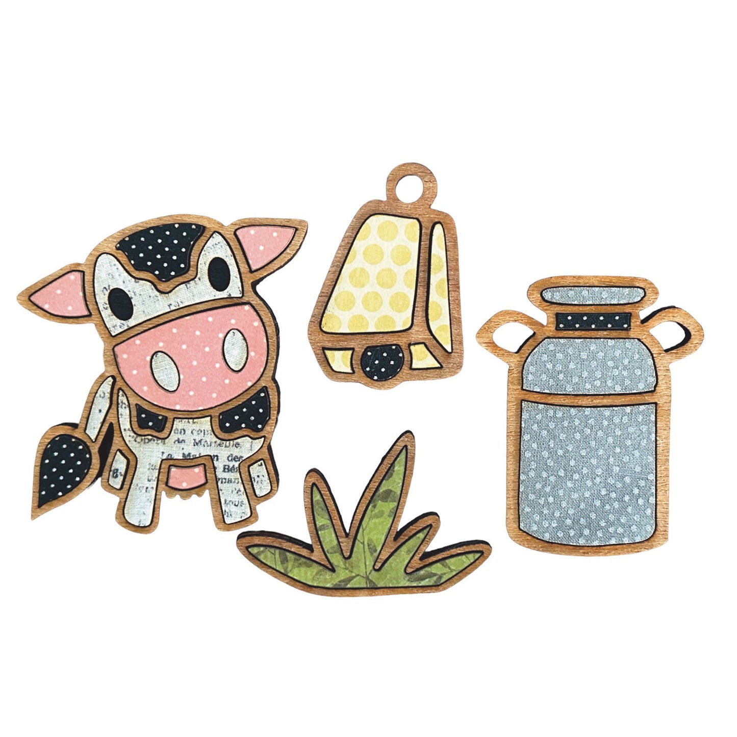 This set of cow-themed magnets makes such a whimsical, and functional, addition to your refrigerator or office decor! With hand-drawn artwork, this laser cut set features four magnet pieces: cow, grass tuft, milk jug, and cowbell, with a top and bottom layer to each. Instructions are included for using papers or fabrics on your inlaid pieces, or you can simply paint them, or just use the top and bottom layers with no inner pieces at all. There are numerous ways to create different looks with these laser cut magnets.