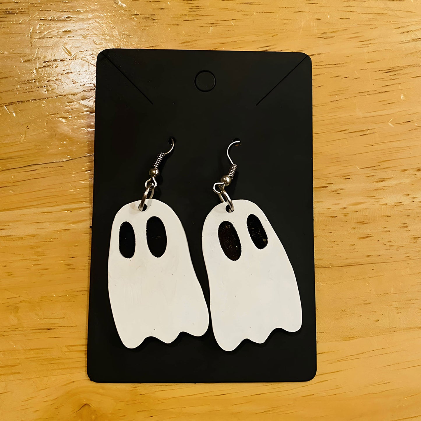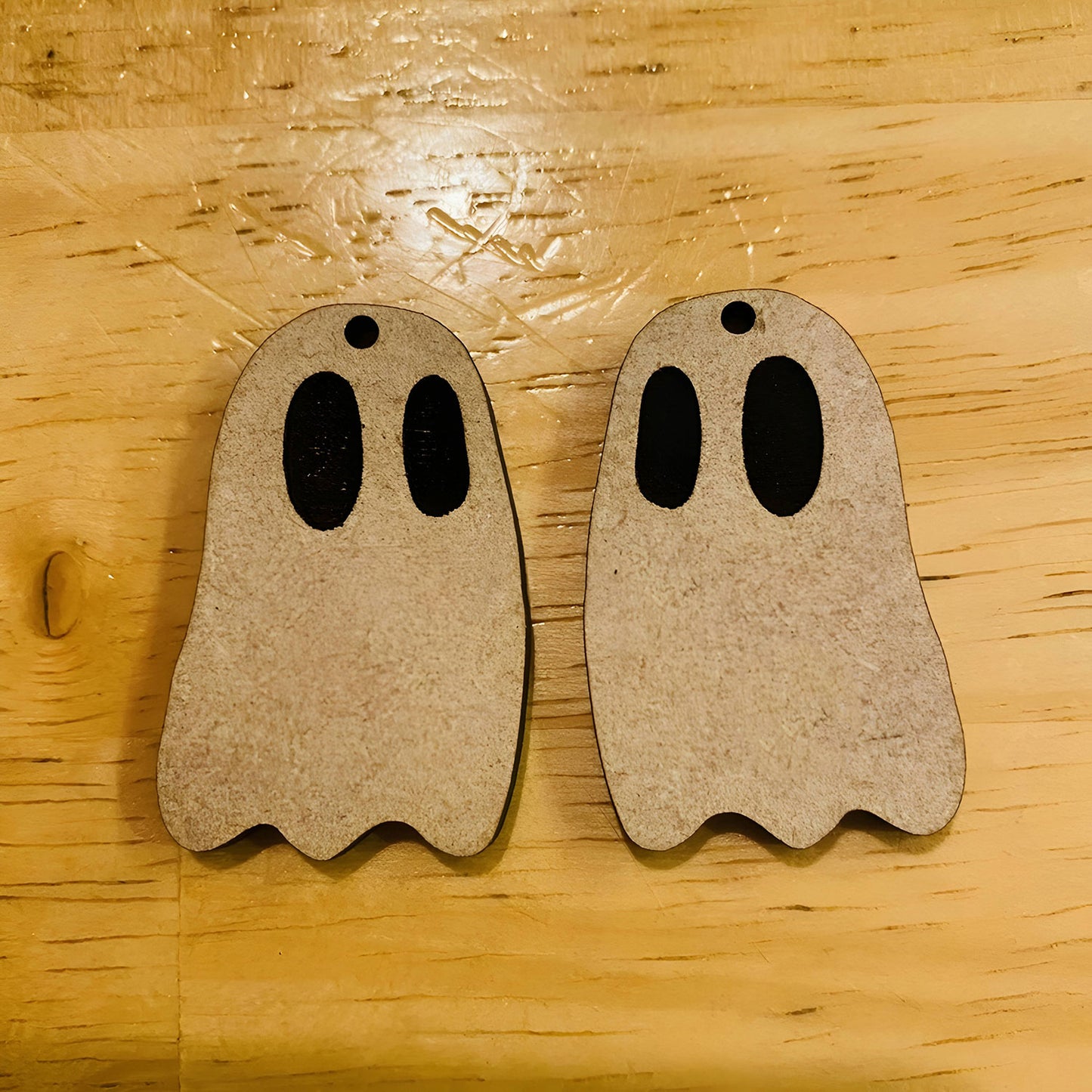 Cute ghost earrings are perfect for Halloween. They are not too scary and cut quickly. I cut mine from medium maple ply and painted to try to make them look wispy and translucent. These are great for using up your small scraps.