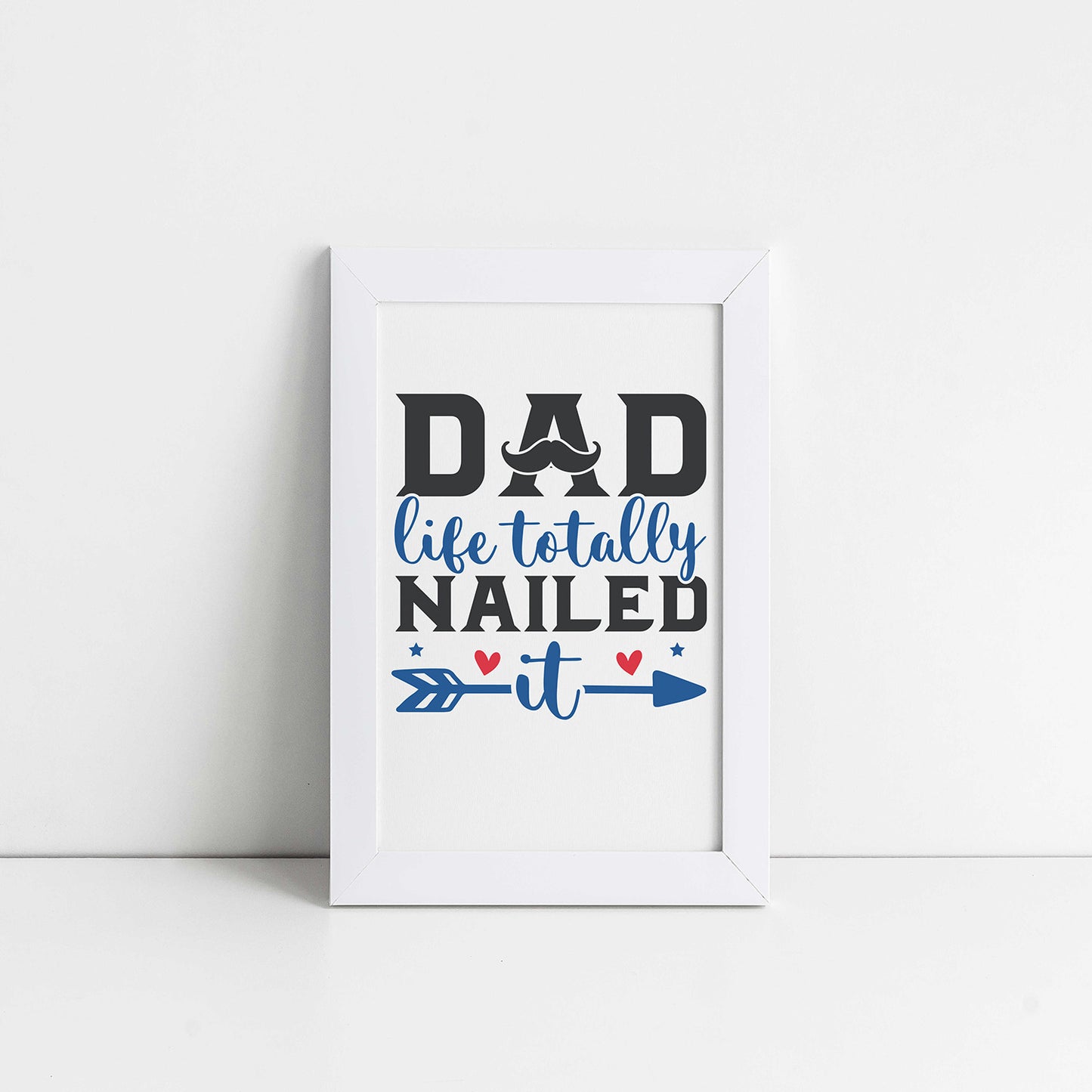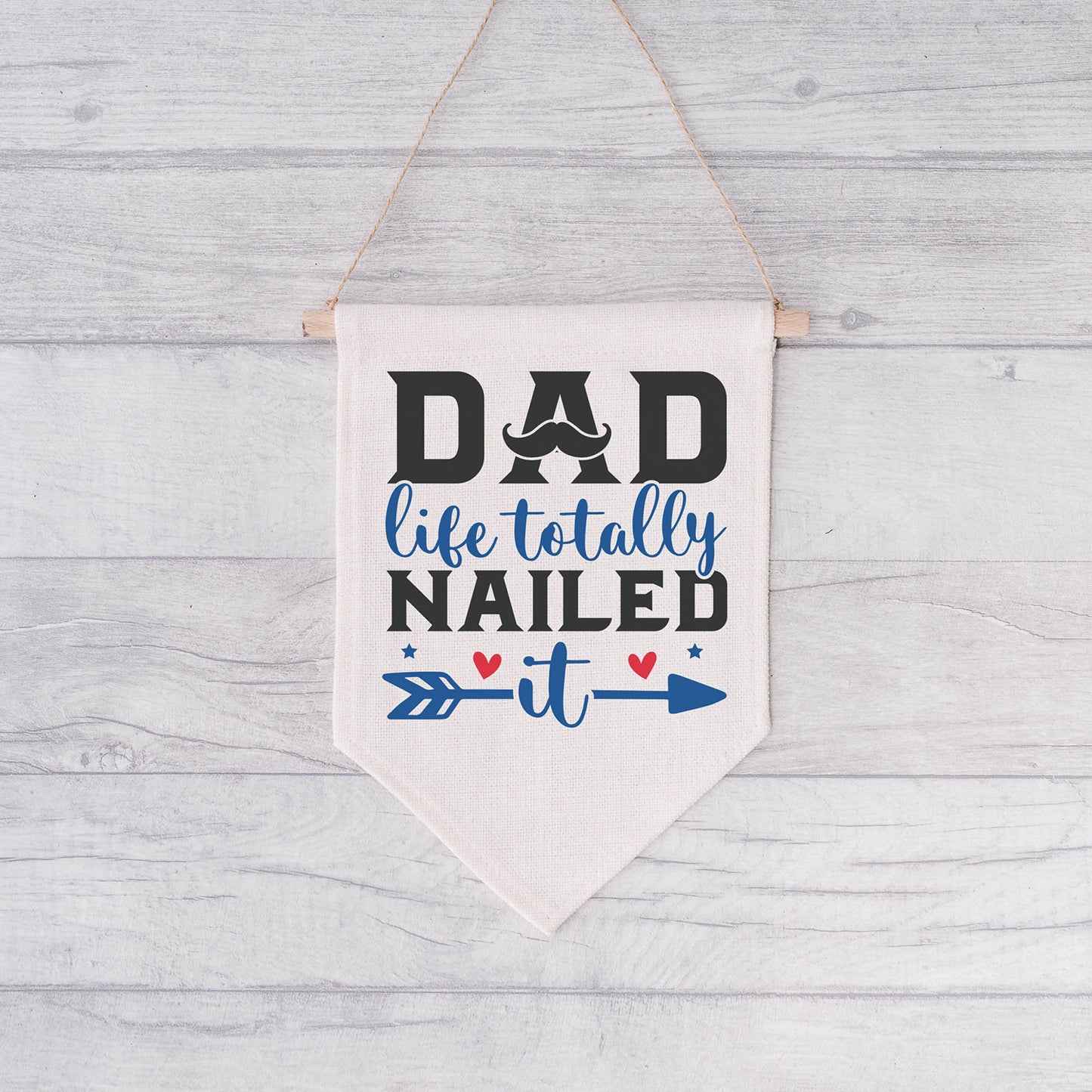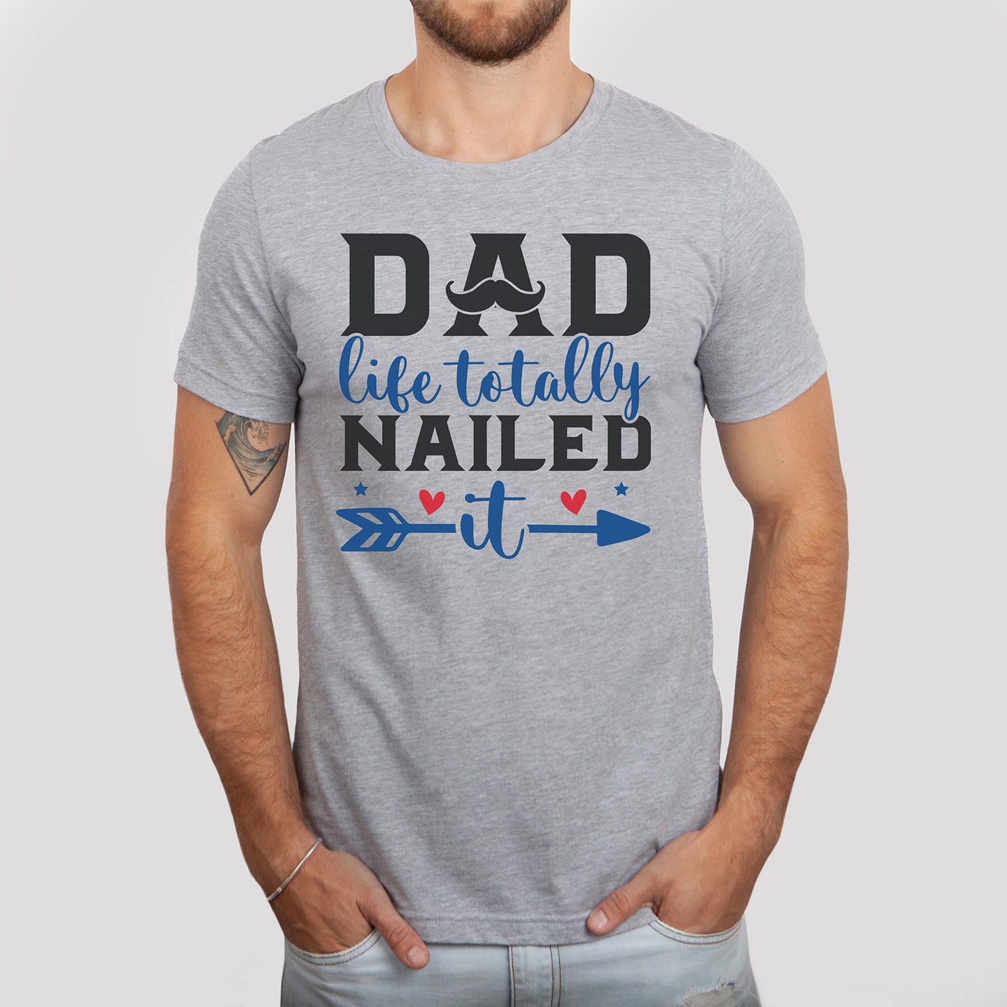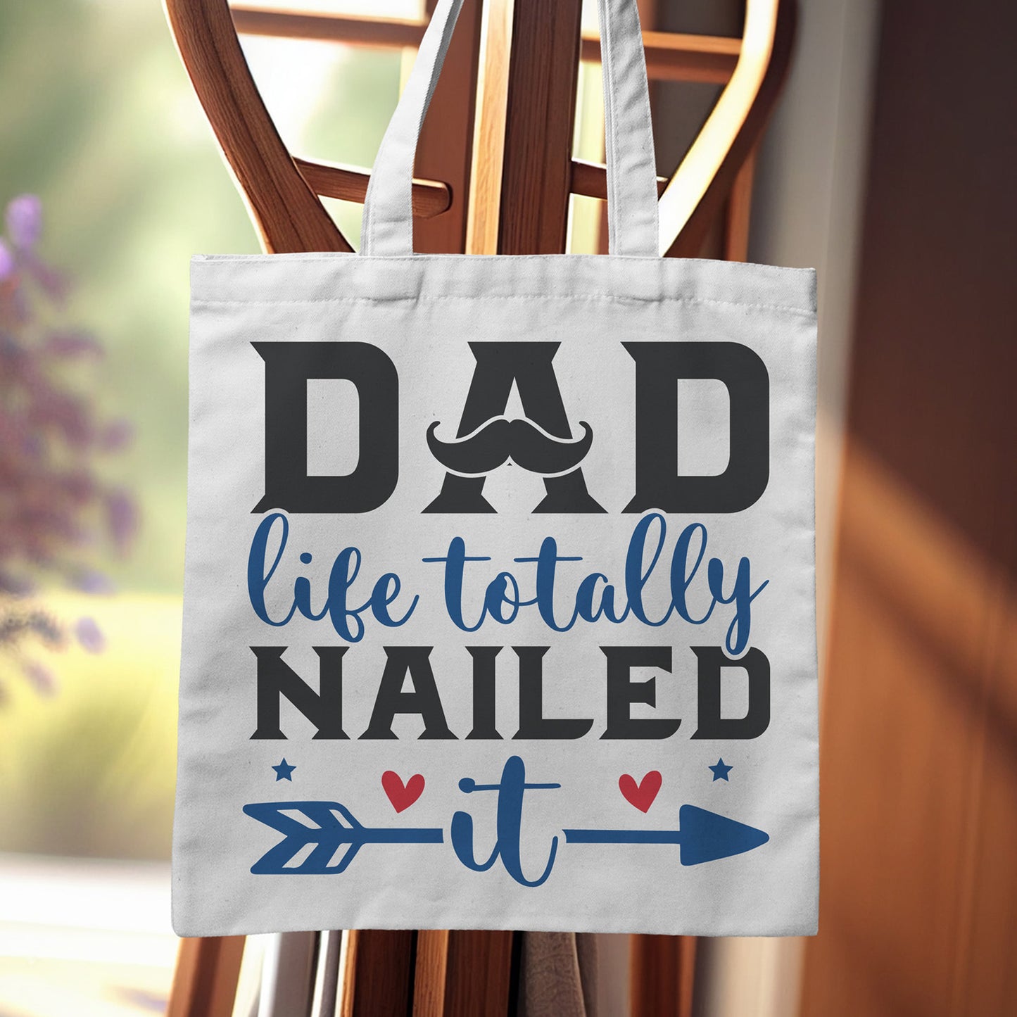 Celebrate the awesome and accomplished Dad Life with our fun and witty "Dad Life Totally Nailed It" graphic, a delightful and light-hearted laser cut design that pays tribute to the hard work, dedication, and love that dads put into their roles. Whether he's changing diapers, coaching sports, or fixing things around the house, this design lets him know that he's nailing it at being an amazing dad. The high-quality iron-on material ensures long-lasting wear and easy application. Simply iron on to any desired item or surface such as a shirt, tote bag, mug, or anything else you want to show off.