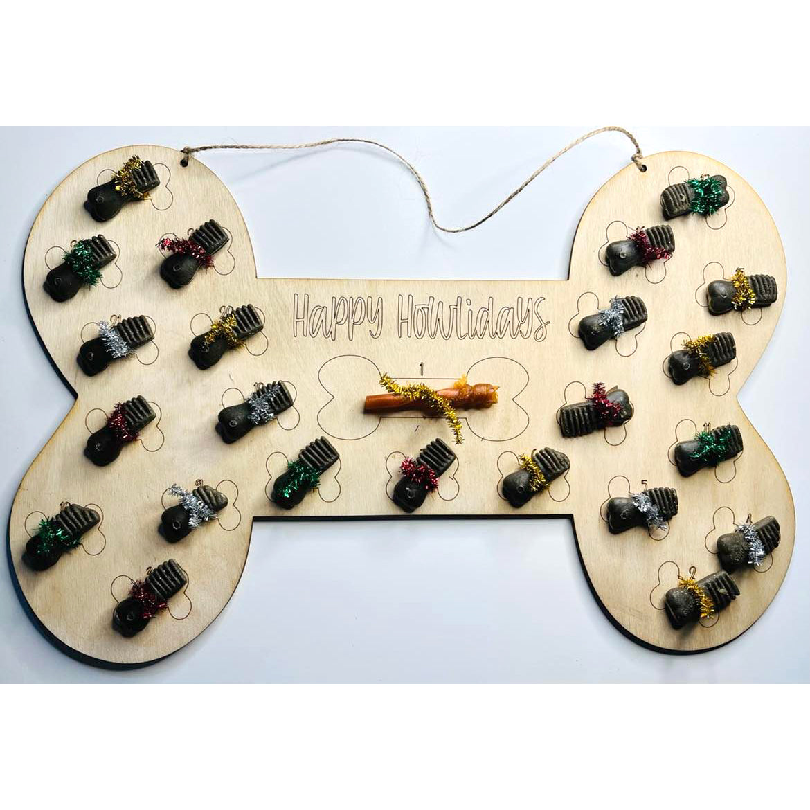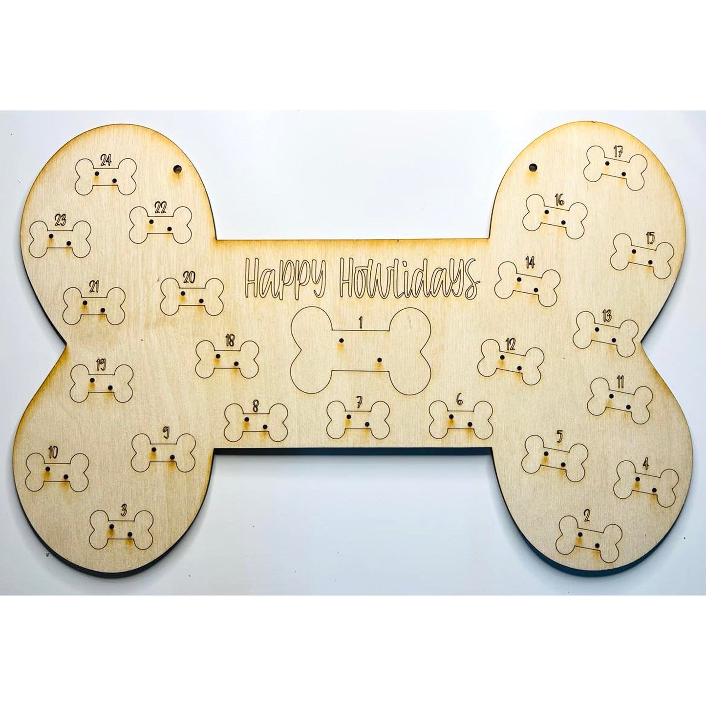 Your pup will love you even more when you use this fun, laser cut advent-style calendar to treat your fur baby daily and countdown to the "Howliday". Using pipe cleaners, simply add a small treat to each day (2-25) and then a large bone or large treat on day 1.