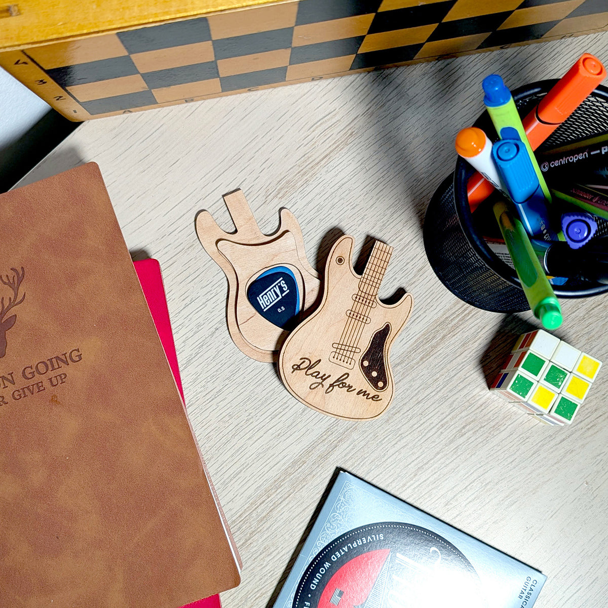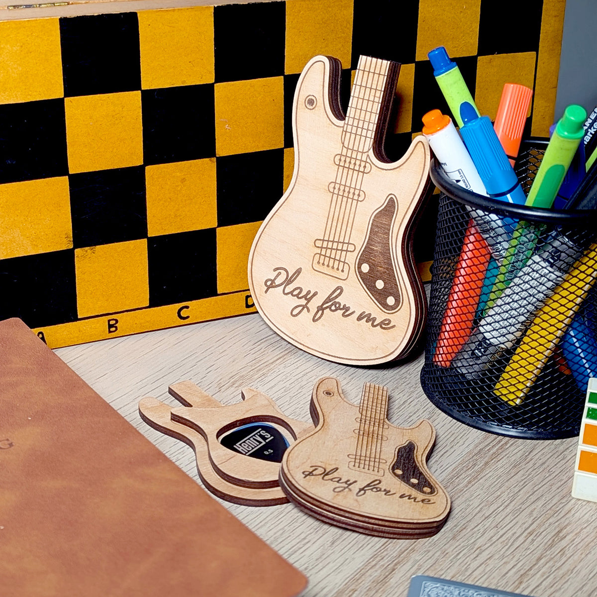 A sleek electric guitar pick holder. Keeps picks organized and easily accessible during rehearsals or performances. Perfect for guitarists of all levels. A practical accessory and a thoughtful gift for any music enthusiast.