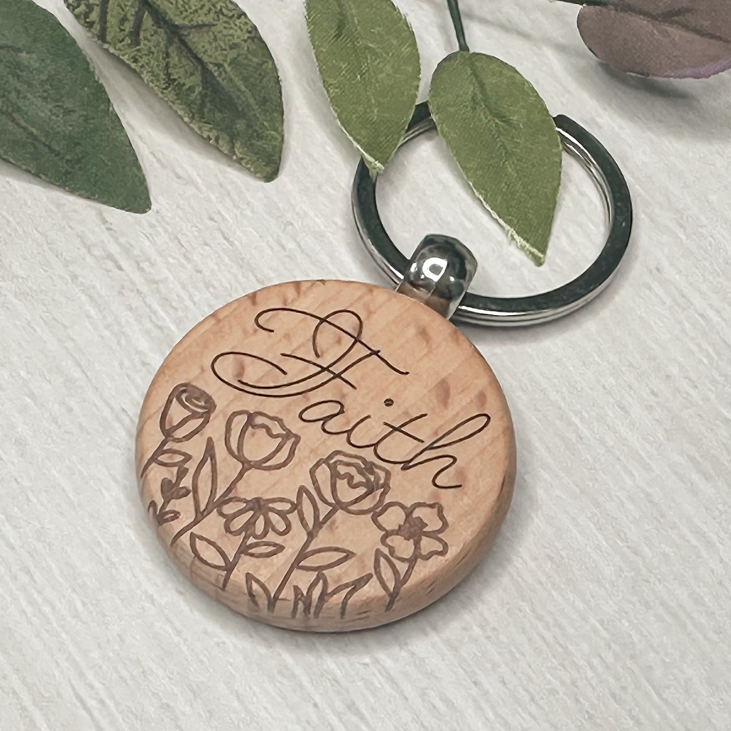 Embrace the elegance and inspiration of our "Faith with Flowers" design. This beautiful piece features the word "Faith" rendered in a stunning script, accompanied by delicately hand-drawn florals, creating a harmonious and uplifting visual. Perfect for engraving onto a keychain. Adds a touch of grace and beauty to any project. Whether used for personal inspiration or as a meaningful gift, the "Faith with Flowers" design will surely inspire and uplift.