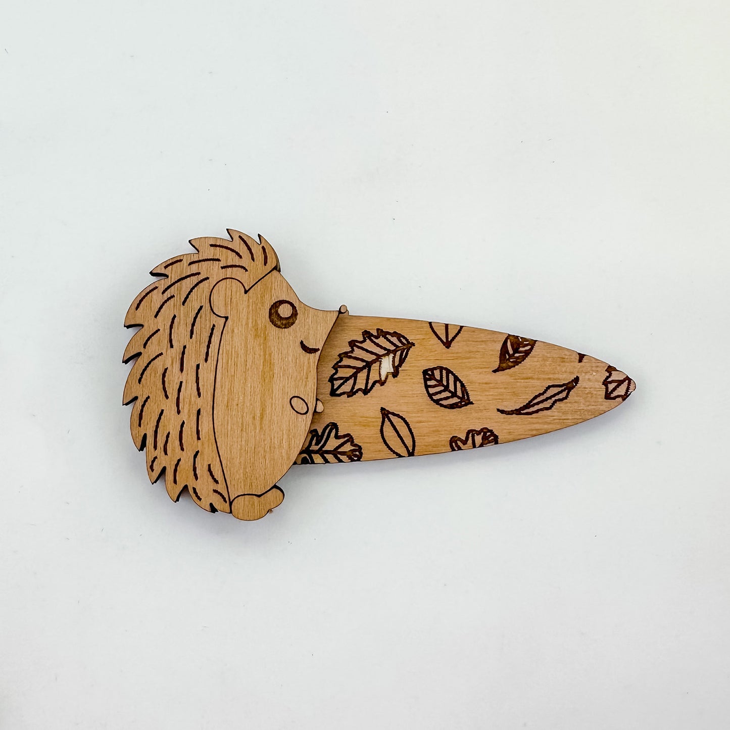 This laser cut hair clip is a two-layer design with a fall leaf pattern on the bottom and a cute hedgehog layered on top. It looks cute painted or left plain. Glue a hair clip on the back and enjoy your new laser cut hair accessory.