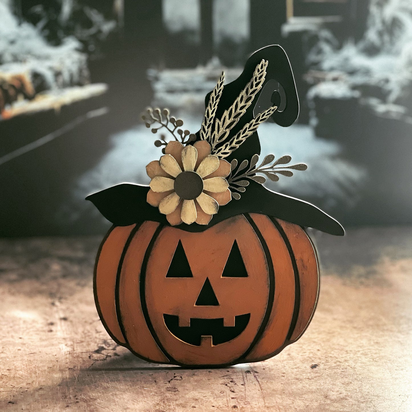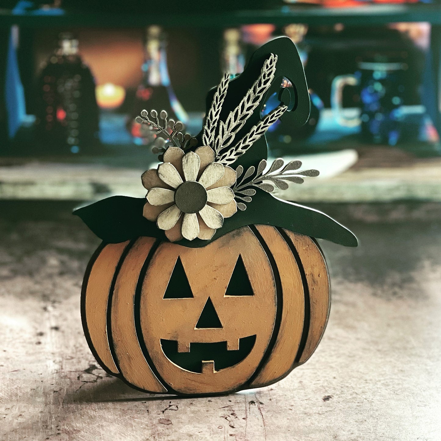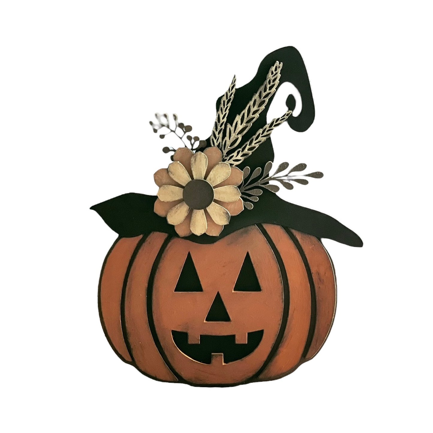 A fun way to decorate for Halloween with a laser cut Jack O Lantern! Adorned with hand-drawn sunflowers, wheat, and florals finished with chalk paints and distressed with stamp pads. Recommend this be made with medium proofgrade draft board to fit the stand that glues to the back or lean against your walls or other objects you have on your shelves. You can use this laser cutting design on a round sign! So many ways to use this! Great for DIY kits, paint night parties, or use for your small business events! Be sure to use the score lines to assist you with the placement of the objects for easy assembly. Happy crafting.