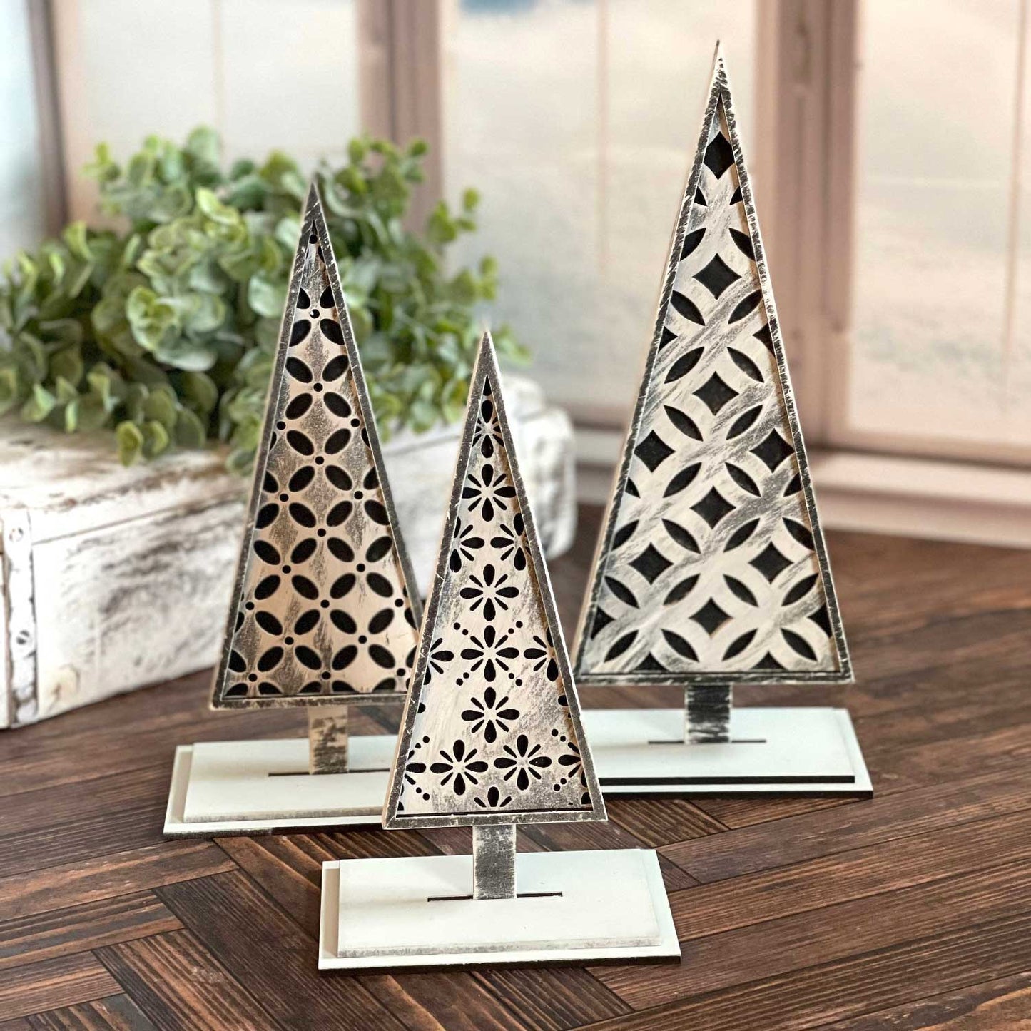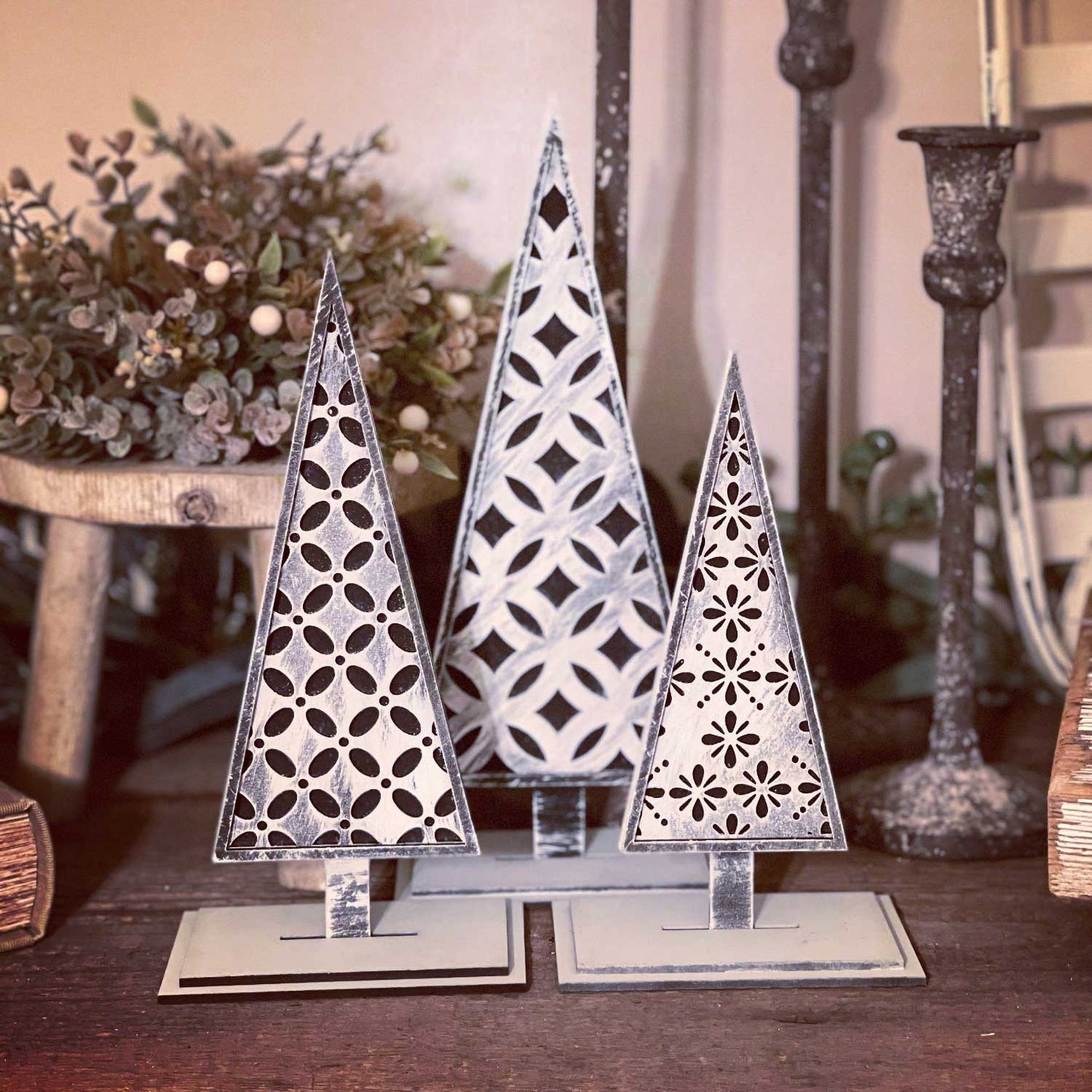 A rustic and farmhouse-style trio of trees to adorn your mantle, shelves, or table tops this holiday and winter season. Make them with proof grade medium draft board and paint them with chalk paint to distress them and create that farmhouse look. These laser cut trees measure 7.5-10.5" tall to give just the right height to add a little flair to your existing decor. Perfect for DIY kits, paint parties, or add to your small business collection! Wow your friends this holiday season with a handmade gift made by you. Happy crafting.
