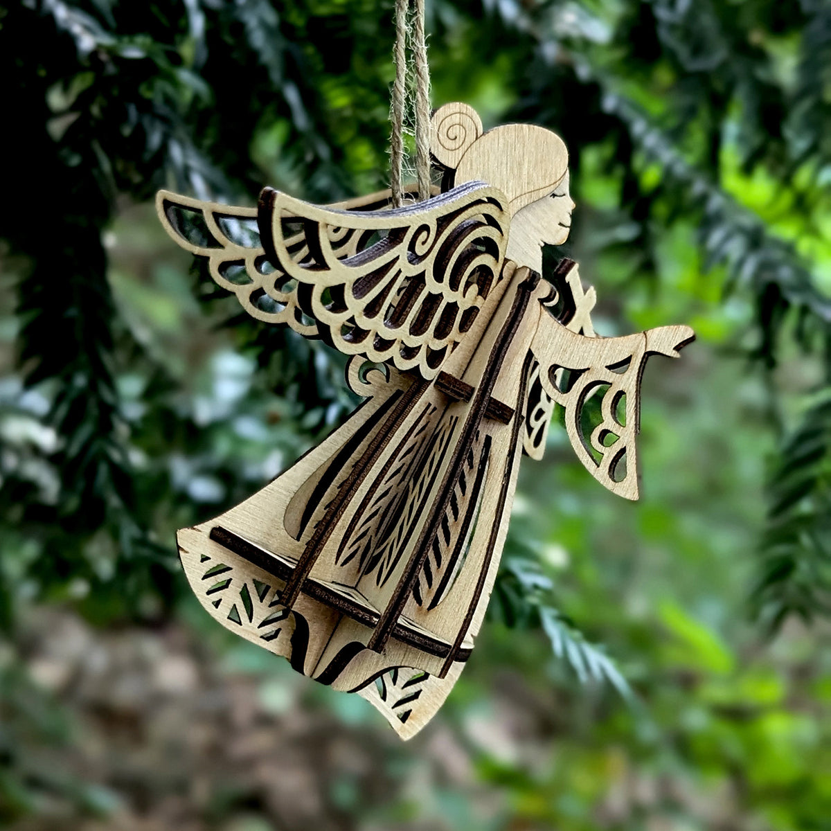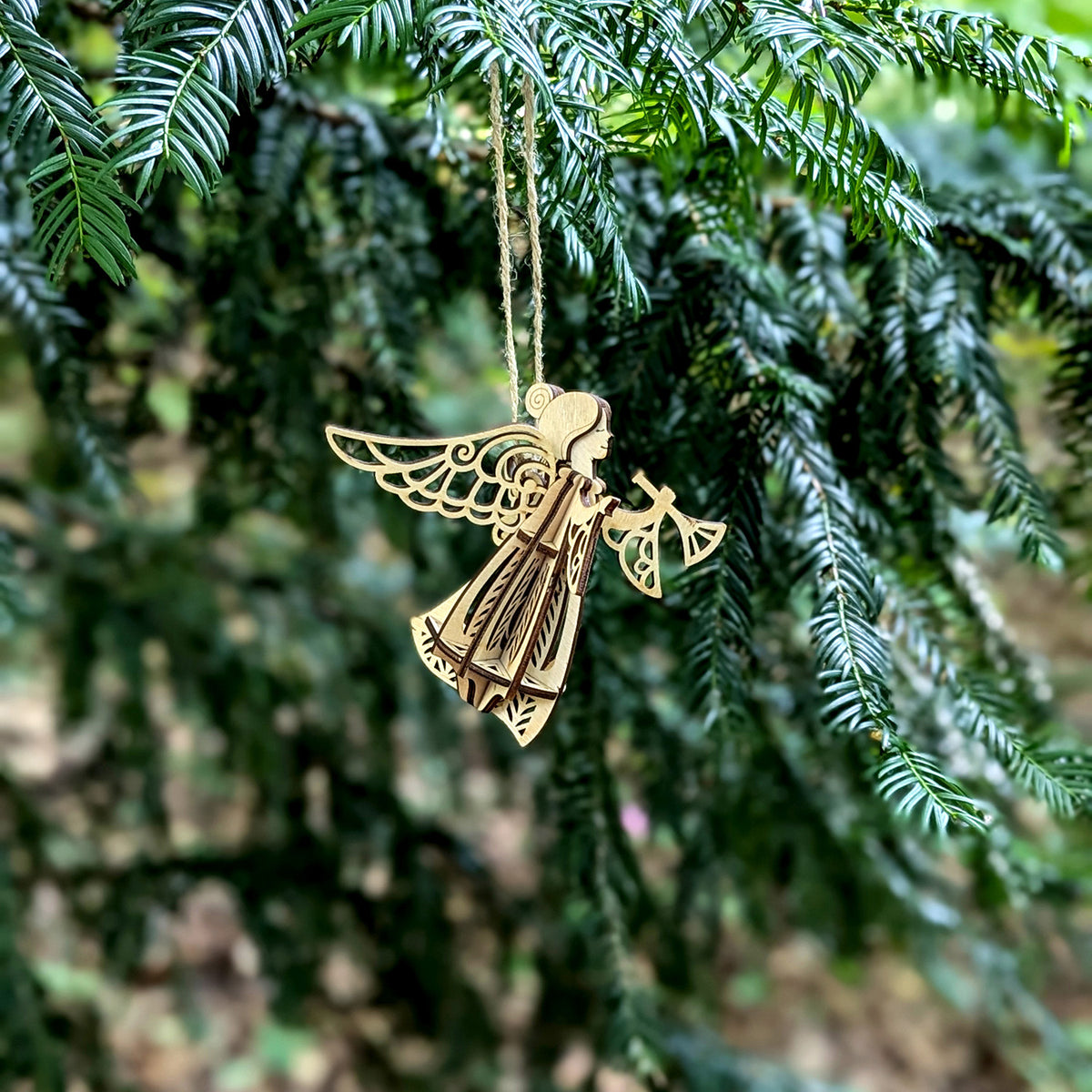 A graceful angel Christmas tree ornament, depicted in mid-flight, wings outstretched. This heavenly decoration symbolizes peace, hope, and the magic of the holiday season.