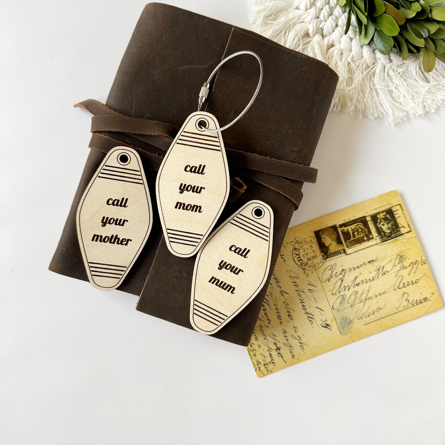 Retro Motel Keychain Set—perfect for college students with a sense of humor! These vintage-inspired keychains come in the classic old-timey motel keychain shape and feature funny reminders to call your mom, mum, or other female family members. Personalize it on the back side with the student’s name or phone number. These quirky keychains will help them remember to check in with the ones who love you most. Also available for Dads and Grandpas in another group of listings. A blank keychain will is also provided for your message. It can also be used as a fun way to identify a backpack or luggage.