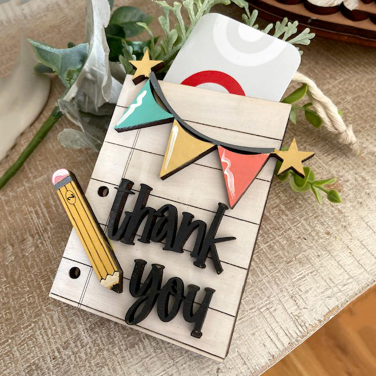 Step up your gift card gift-giving with a handmade, laser cut gift card holder. These fun designs are simple to make but so cute. They can be used as an ornament or as a gift card holder. Select from premade text options: "best teacher", "thank you", and "you are appreciated" or customized with your own text and add a name.
