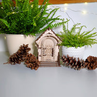 A magical, miniature door adorned with enchanting details, depicting a playful elf girl. This whimsical decoration invites children to believe in the magic of Christmas and the playful elves who watch over them.