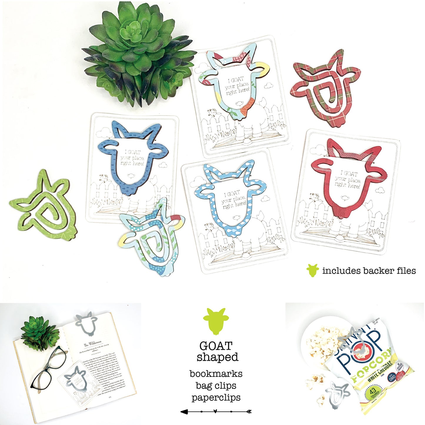 Goat-shaped bookmark laser cut file. These are great book-lover gifts. Includes card backer file which can be scored and laser cut on the poster board using the 20 lb copy paper Glowforge setting. These make great scrap busters! Slide them into a self-sealing cellophane bag and you've got a cute little add-on product that sells great at markets, and bookstores or use them as a promo gift. To create a patterned look, mod podge scrapbook paper to 1/8" wood, let dry, mask with low tack masking tape, and cut.