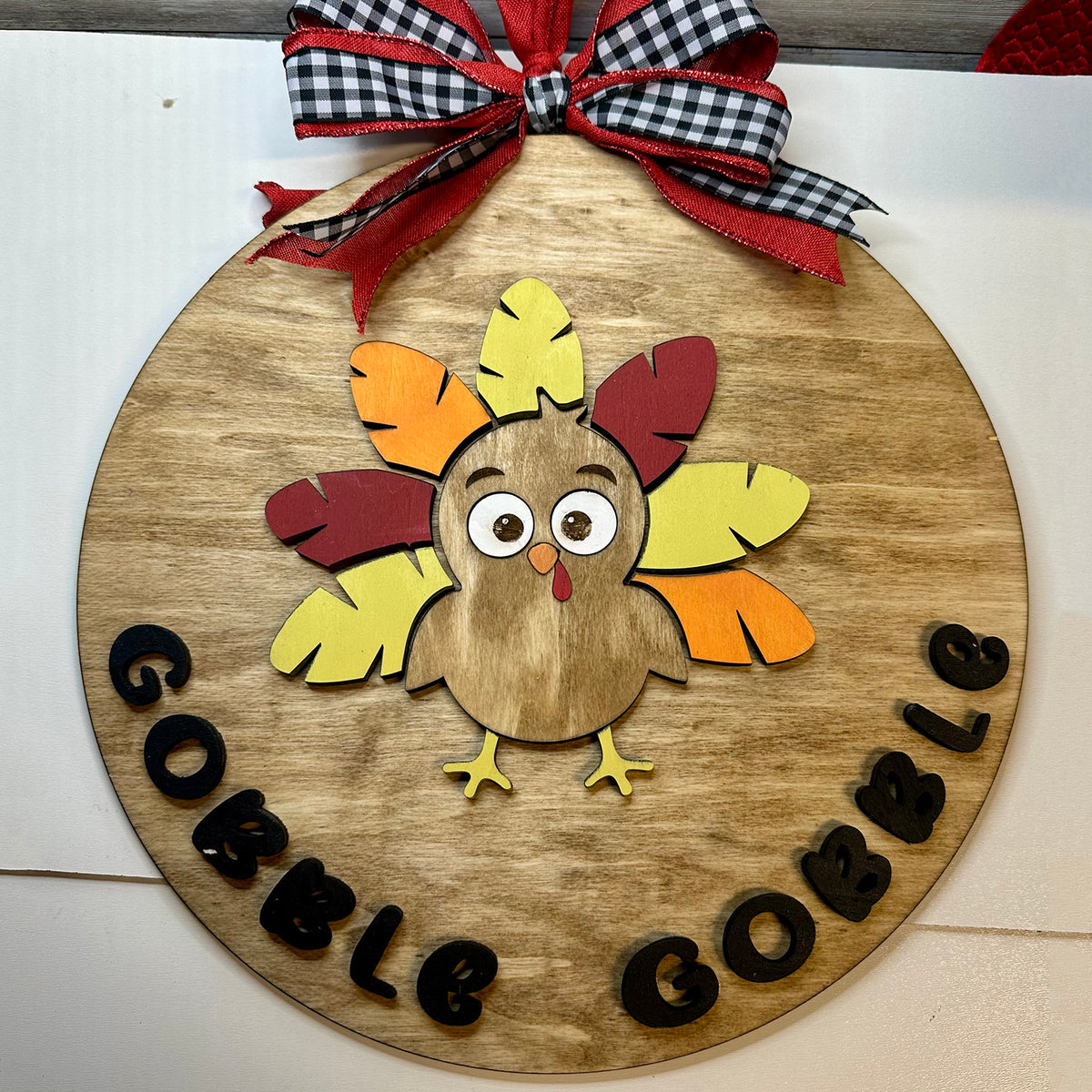 Get into the Thanksgiving spirit with this fun Gobble Gobble door sign. Great for adding a cheerful and festive vibe to your entryway.