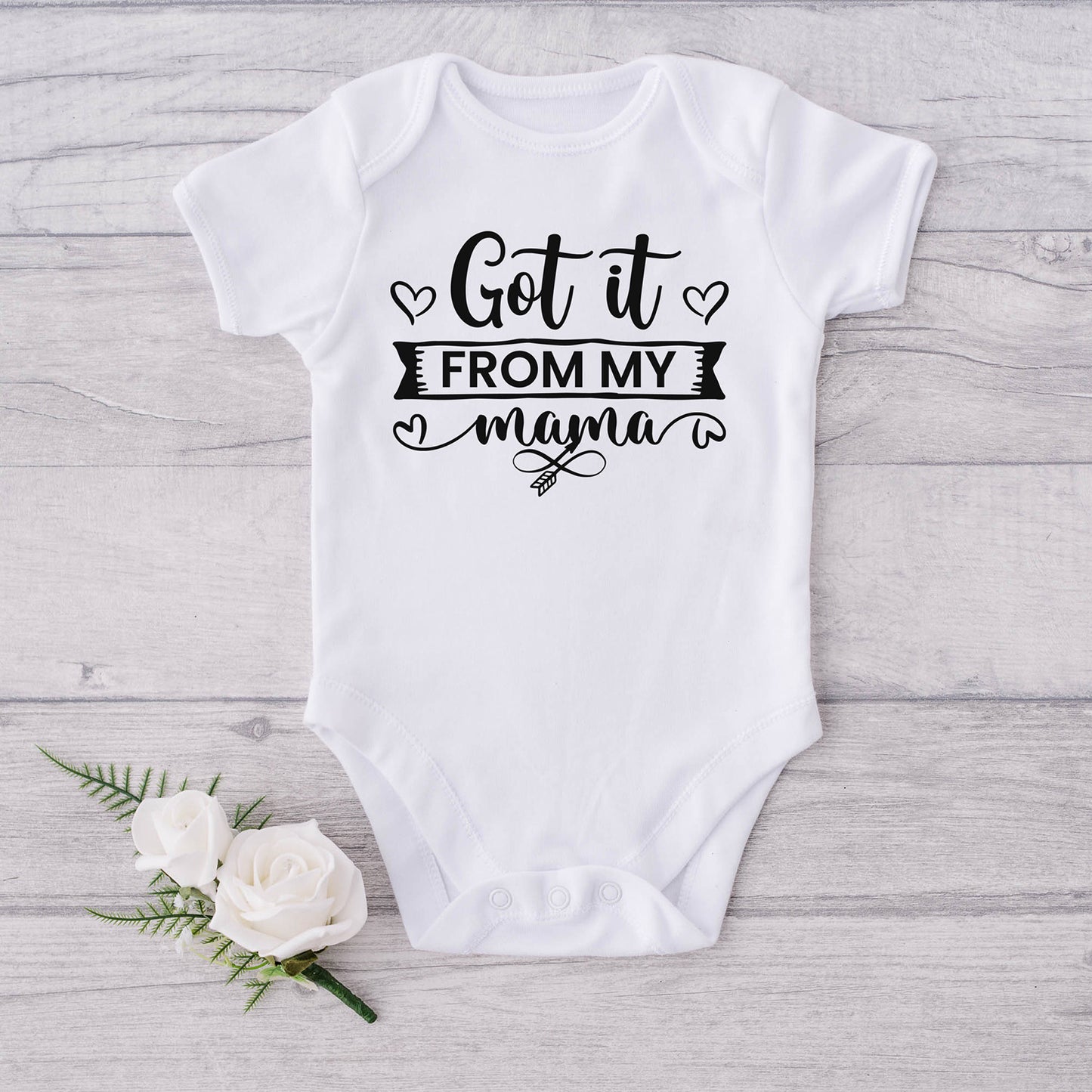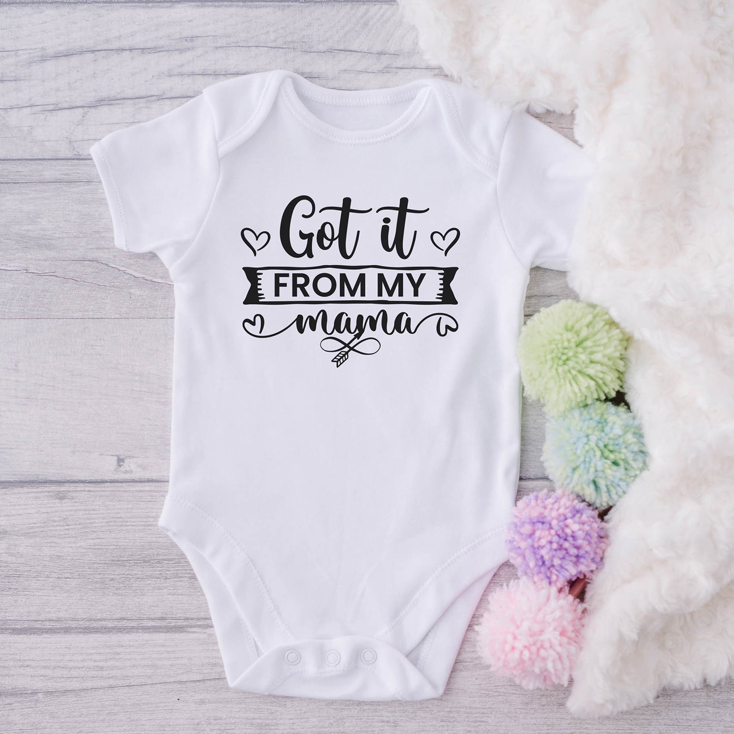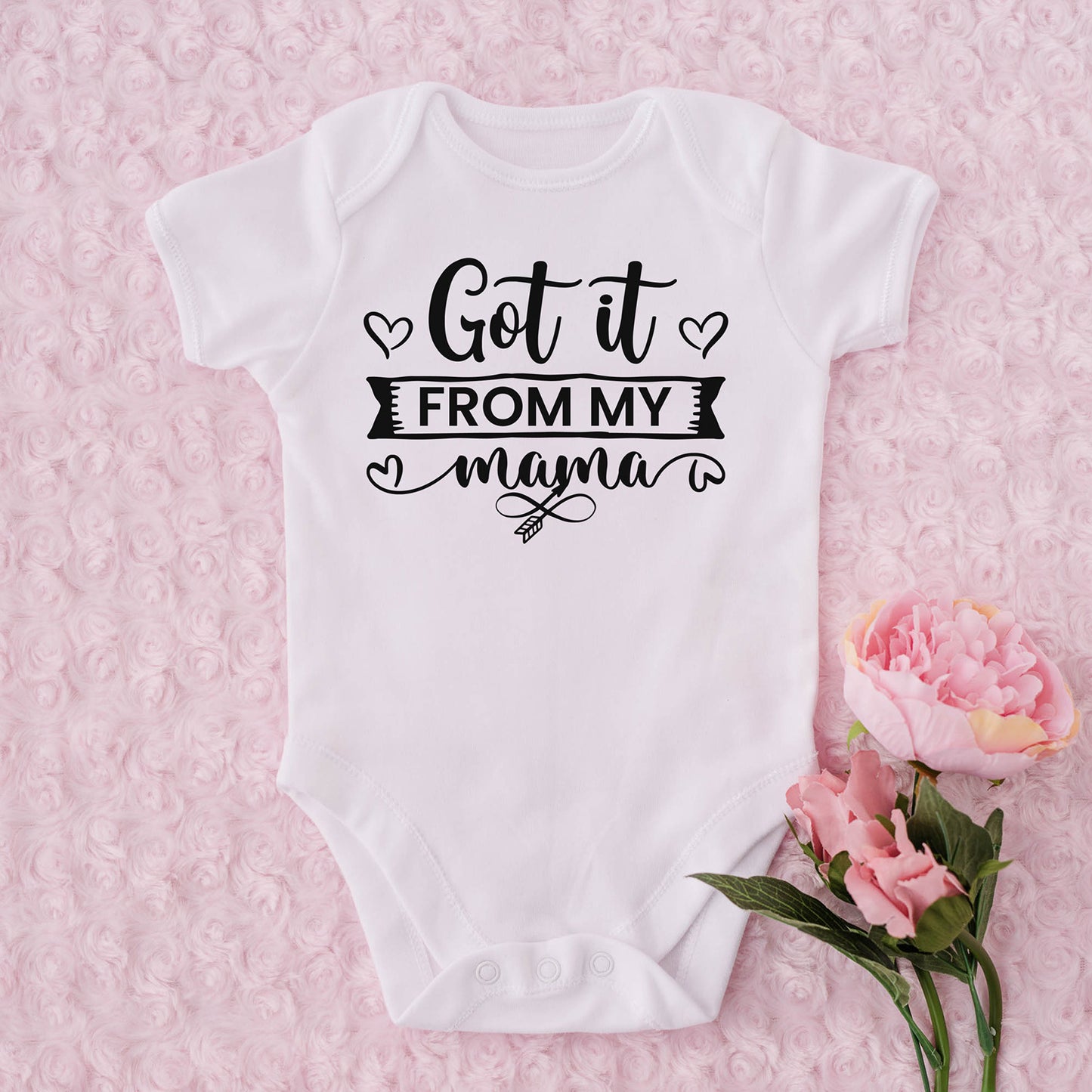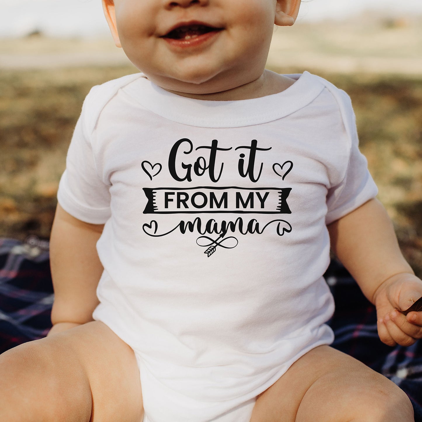 Celebrate the special bond between mother and child with our "Got It From My Mama" Baby Onesie graphic. Crafted with high-quality material for laser cutting, this graphic adds a touch of cuteness and style to your baby's wardrobe, reflecting the connection and love between mother and child.