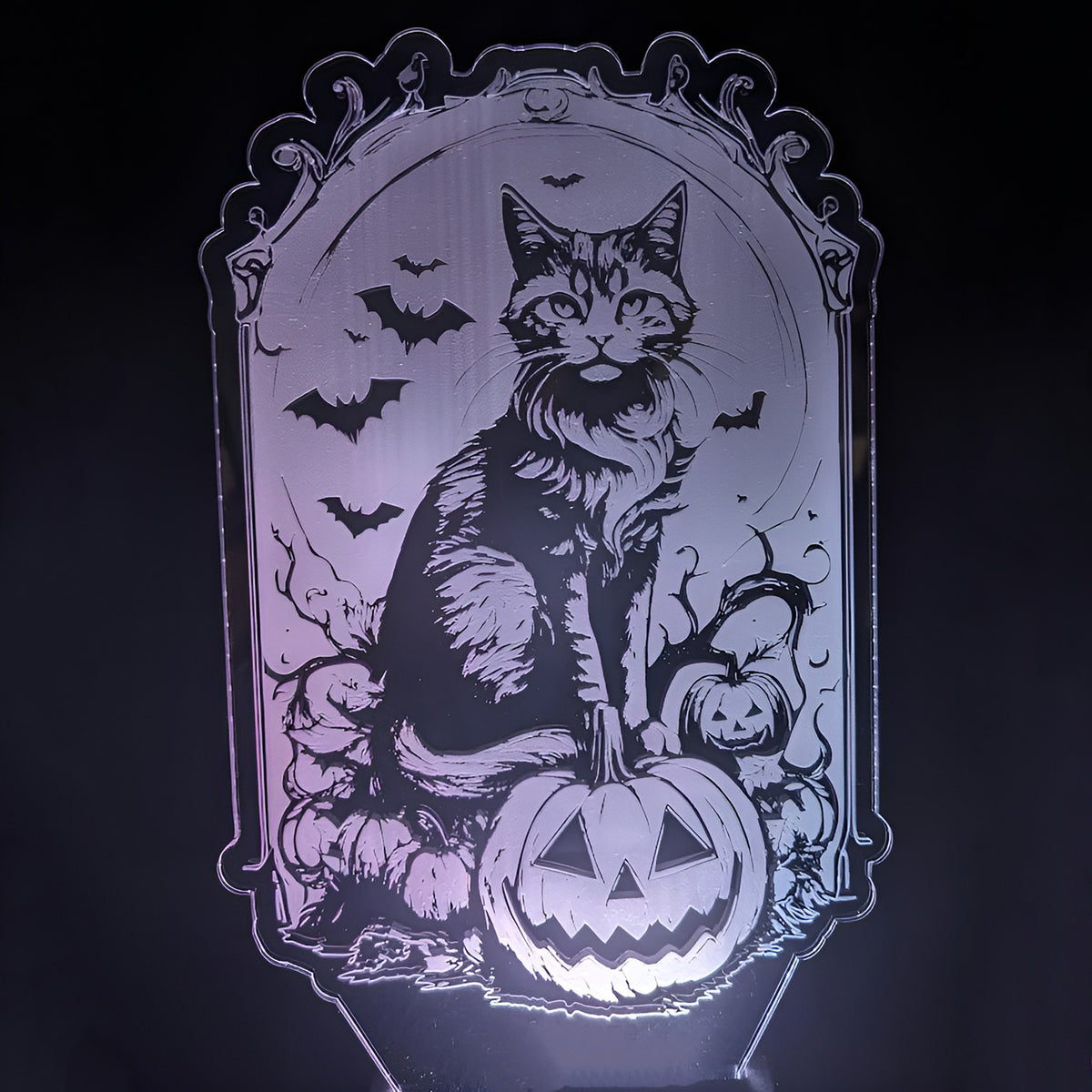This edge-lit acrylic insert for a nightlight base features a beautifully detailed silhouette of a cat sitting gracefully, surrounded by smaller Halloween elements like bats, tiny pumpkins, and more. When illuminated, the design glows with a soft, spooky ambiance, perfect for adding a touch of festive charm to any room during the Halloween season.