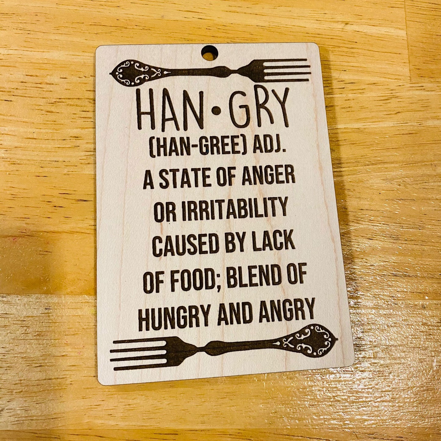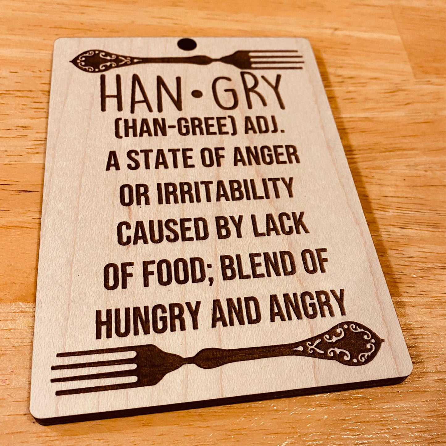 Who else gets hangry? This laser cut funny sign is the perfect addition to your kitchen. You can hang it or sit it on the counter or shelf (just ignore the circle hole step) Display these at your next craft fair/show. It is recommended to use 1/4" thickness wood especially if you are using it as a shelf sitter.