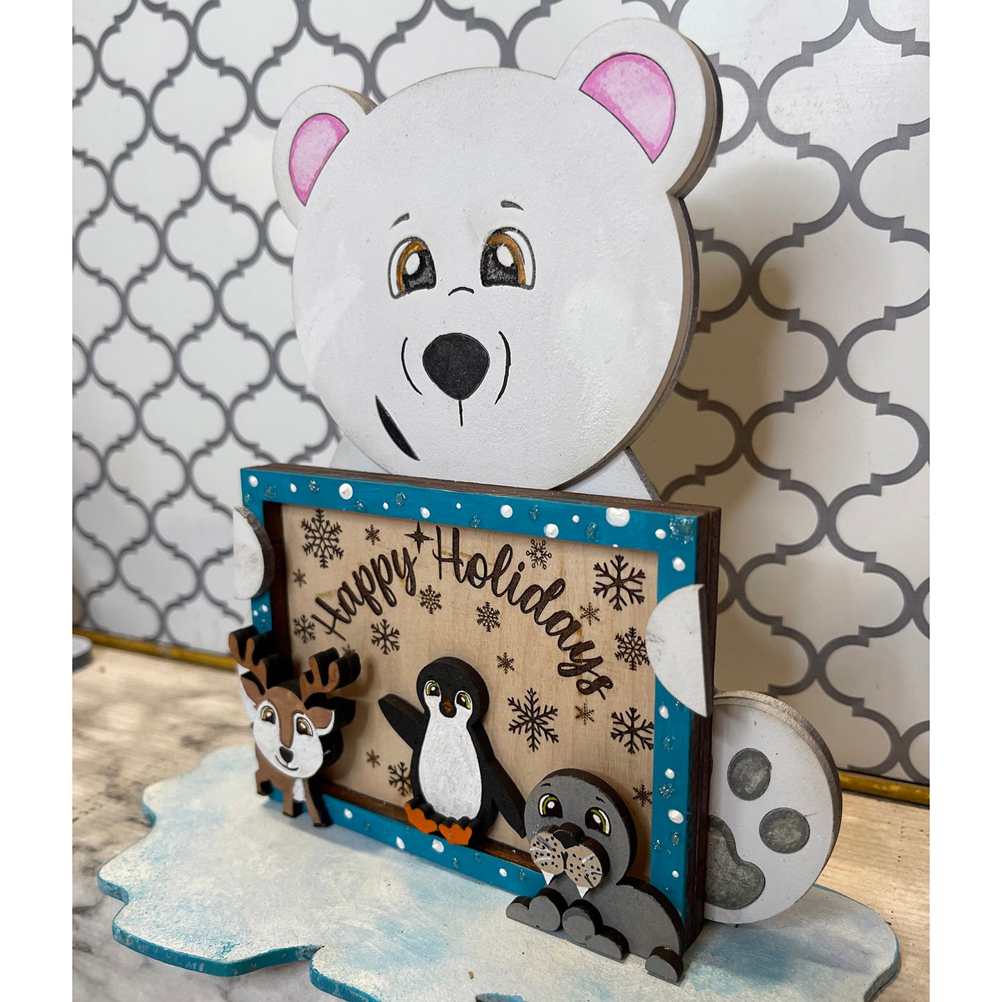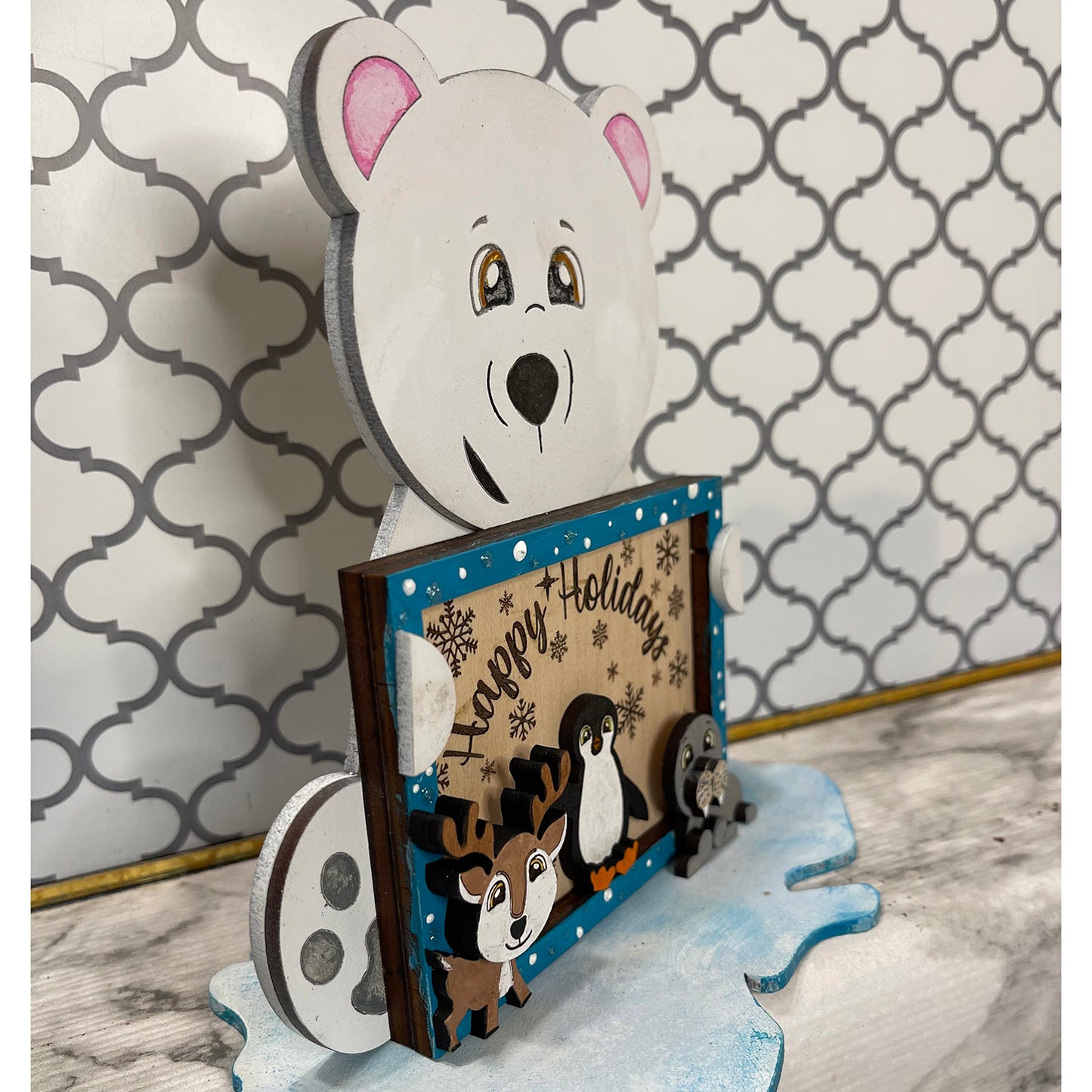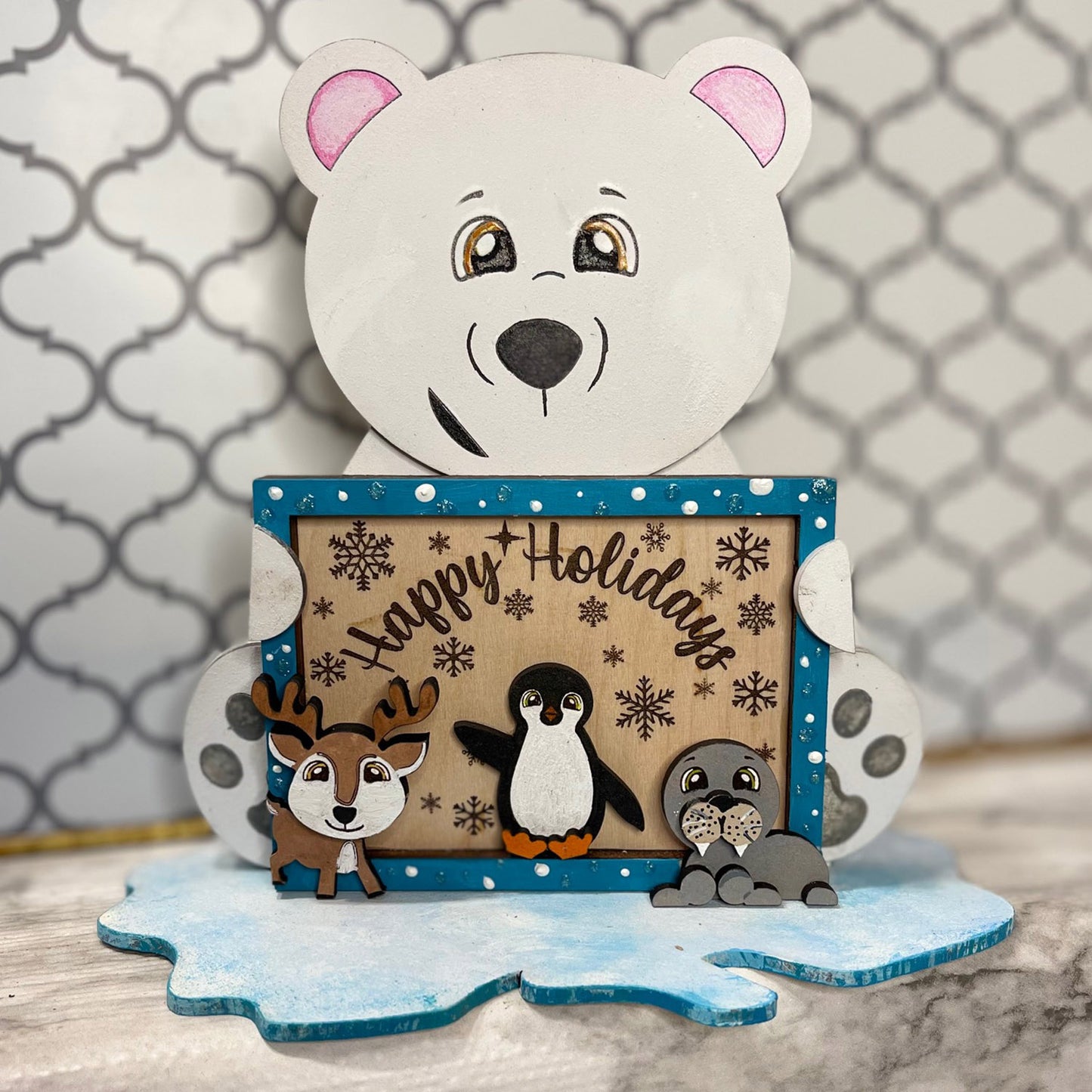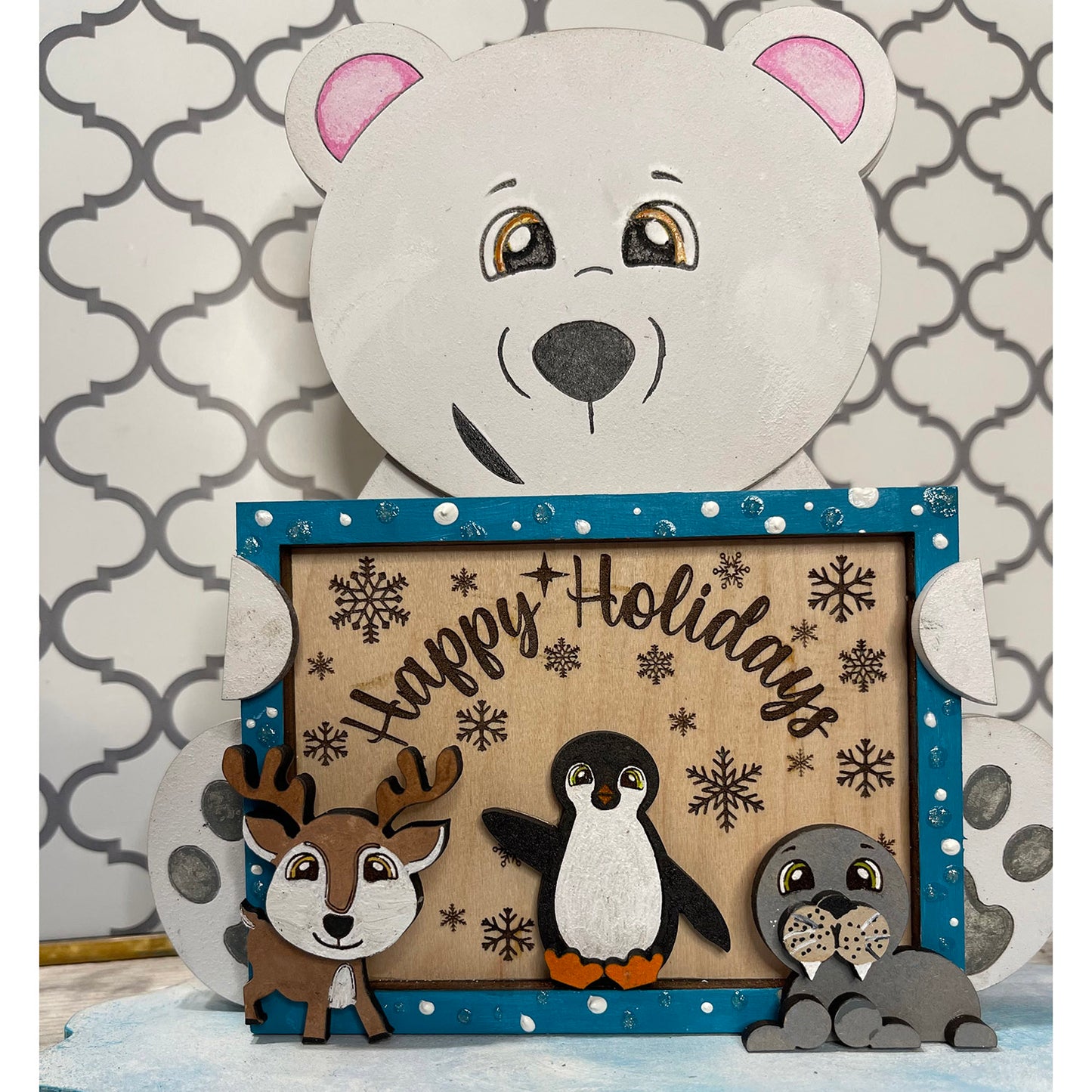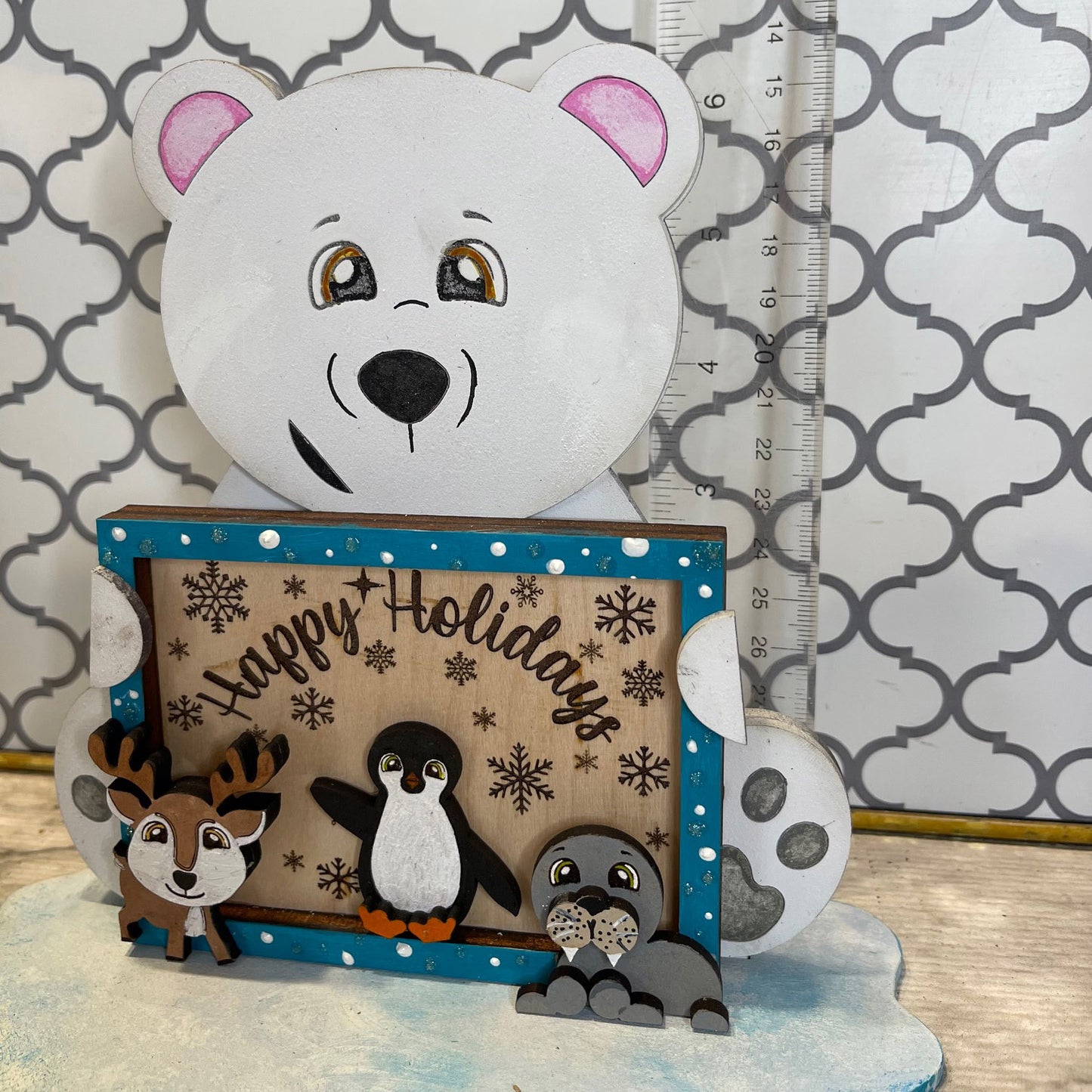 This cute and adorable mini stand is sure to add something special to your desk or shelf or countertop. This little guy sits upon an iceberg holding a sign to merrily greet all who walk by. This laser cut design comes with 1/8" and 1/4" sizes. Use paint pens to paint the little guys and simply glue the sign standing up against the body. This was a fun design to do for me, this little guy is so cute and can even be given as a small gift.