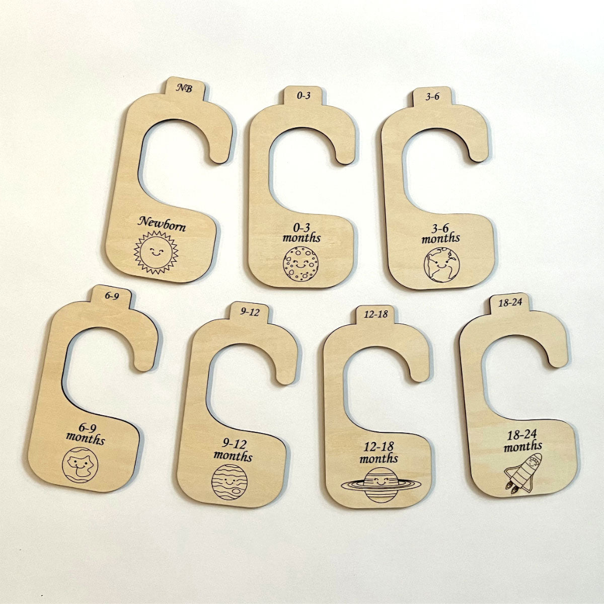 These adorable closet organizers make perfect baby shower gifts! They can be laser cut in three different ways: right-facing, left-facing, or both sides to work with any closet. Please read the instructions carefully to ensure success.