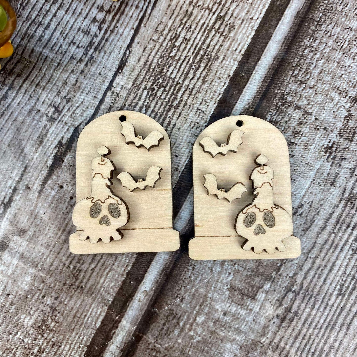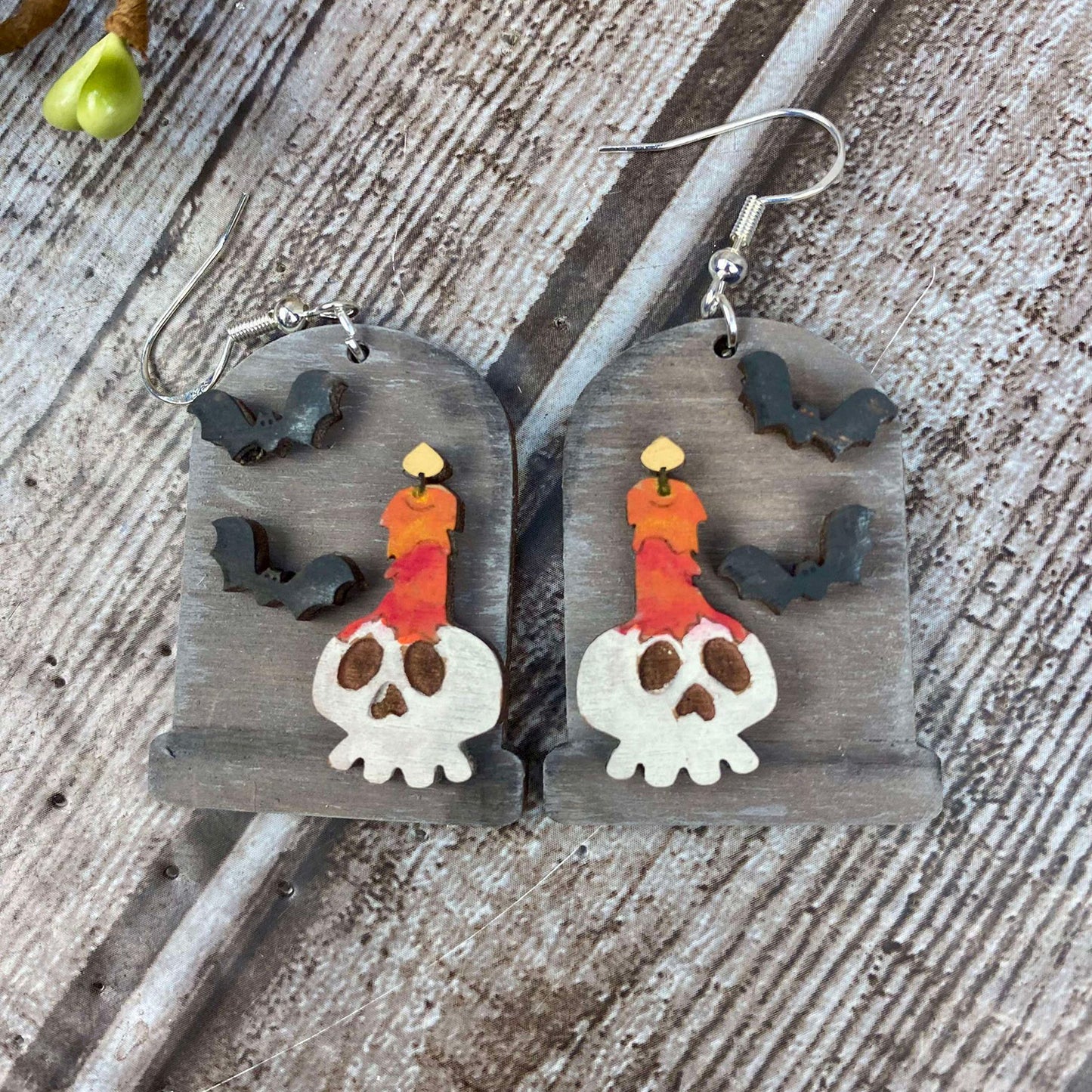 These haunting earrings are perfect for adding a spooky touch to your Halloween ensemble. The design features a hauntingly beautiful scene with a skull-shaped candle dripping wax. Two black bats flutter above, all set against a tombstone-shaped background. These lightweight earrings are both stylish and comfortable to wear. The detailed craftsmanship and playful design make these earrings a must-have accessory for the Halloween season or any time you want to add a bit of eerie charm to your outfit.