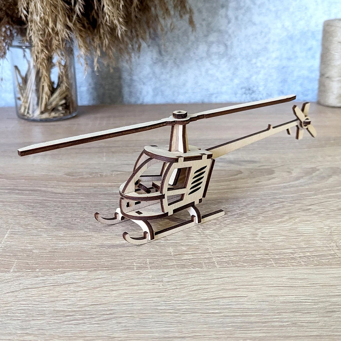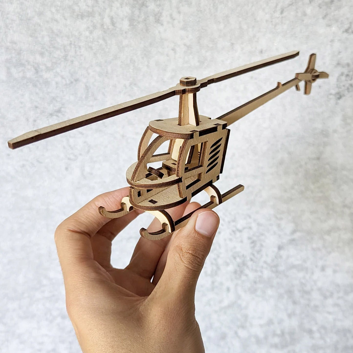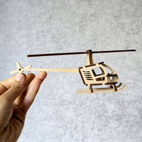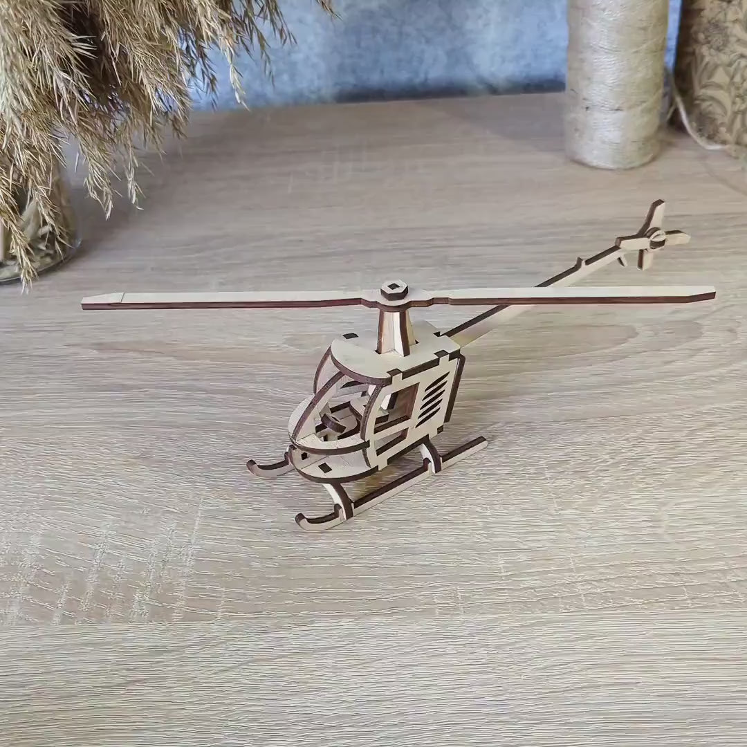 This laser cut 3D Helicopter R44 scale model has moving rotor blades and realistic design. Ready for imaginative entertainment or for studying aviation.