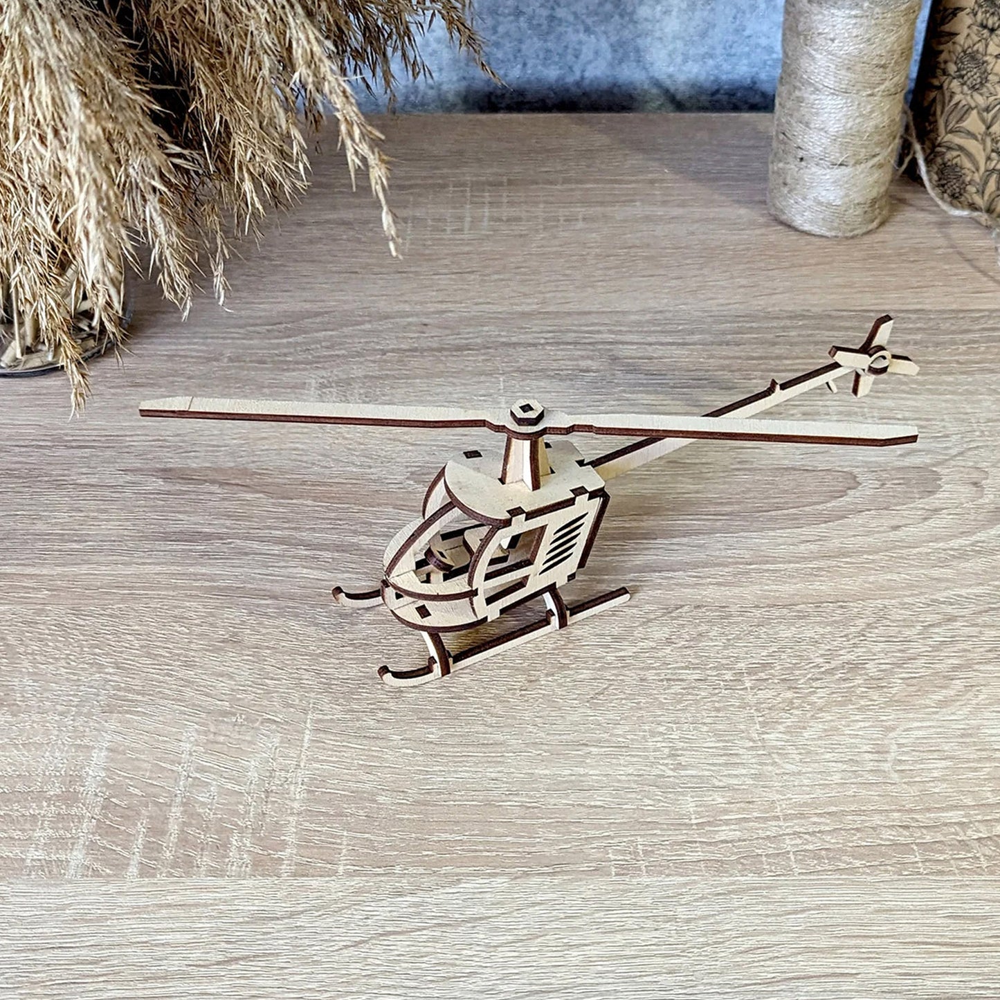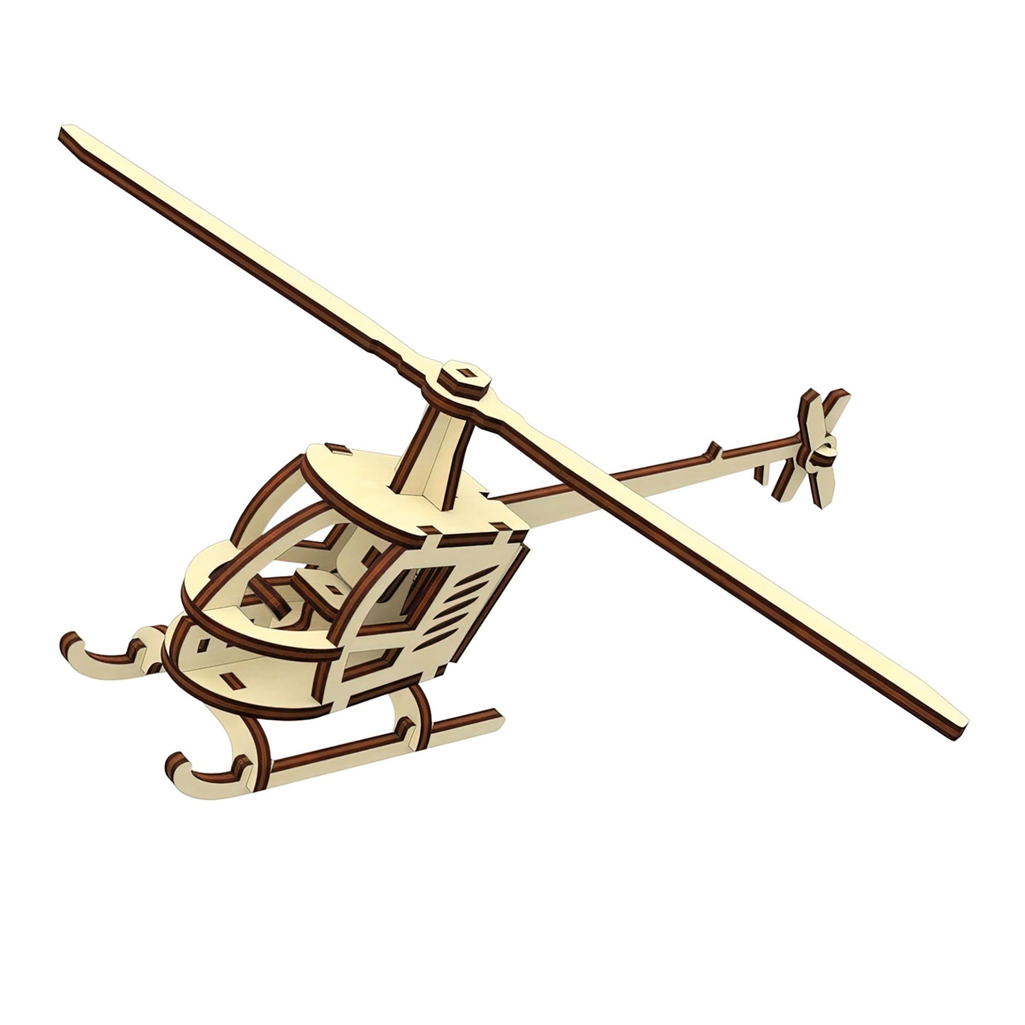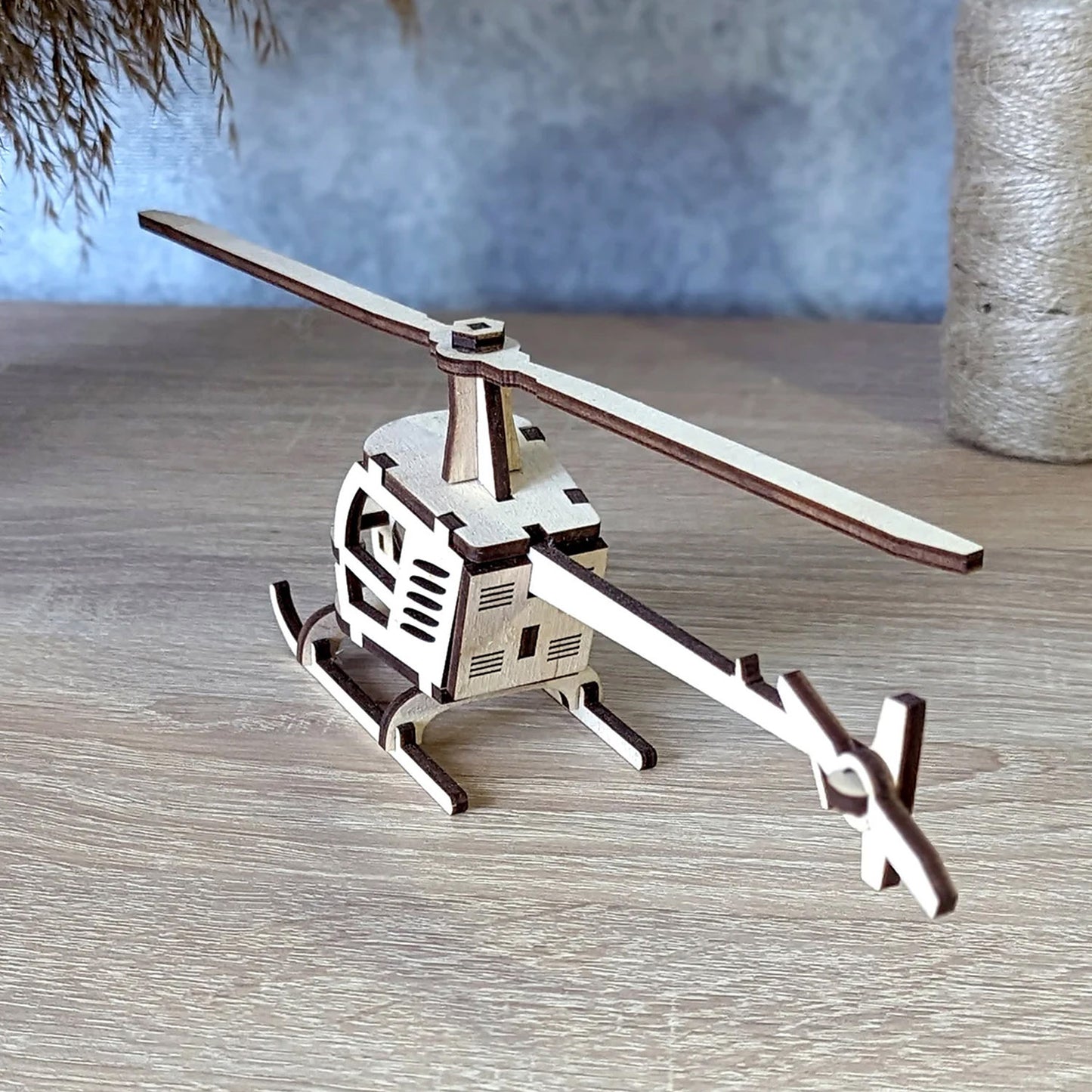 This laser cut 3D Helicopter R44 scale model has moving rotor blades and realistic design. Ready for imaginative entertainment or for studying aviation.
