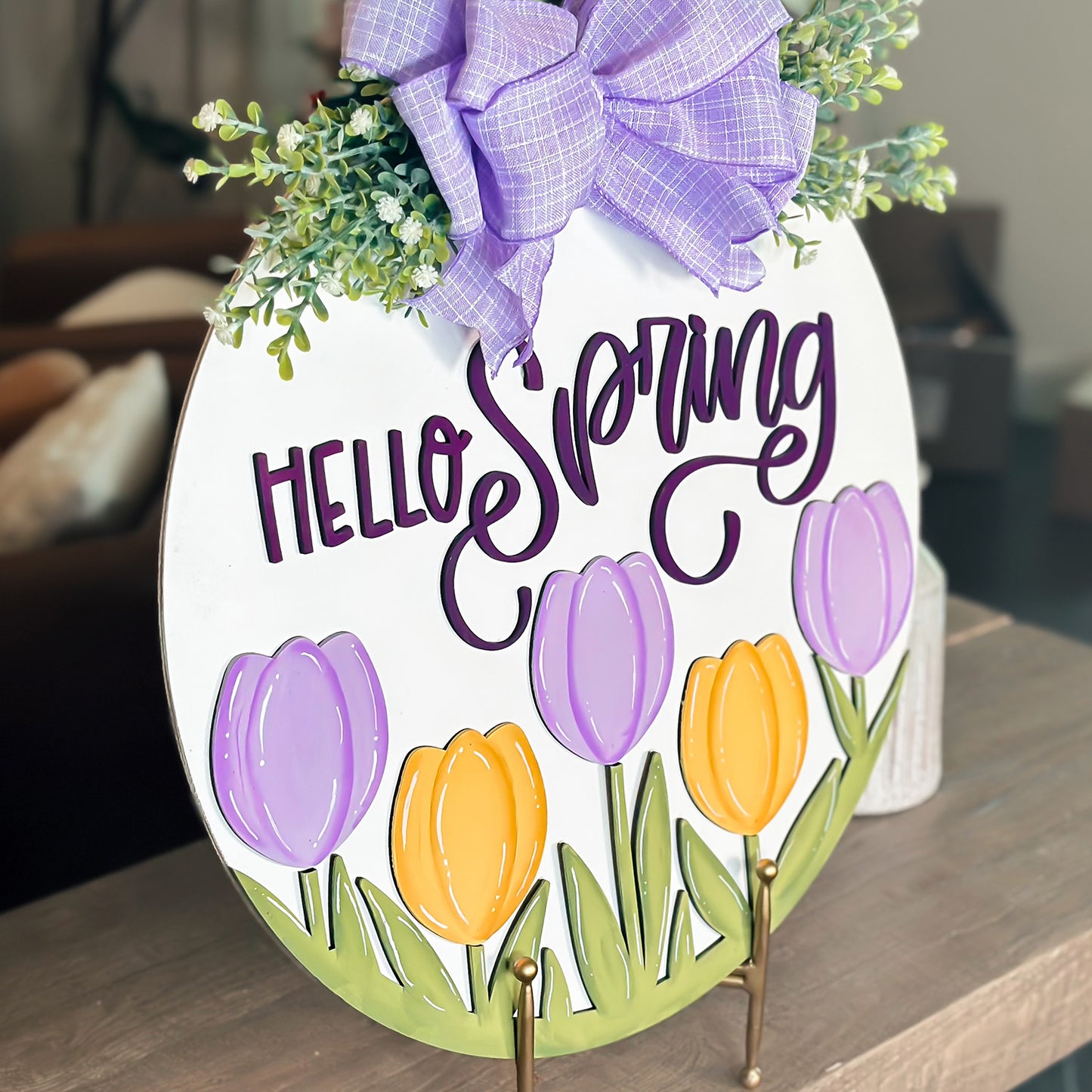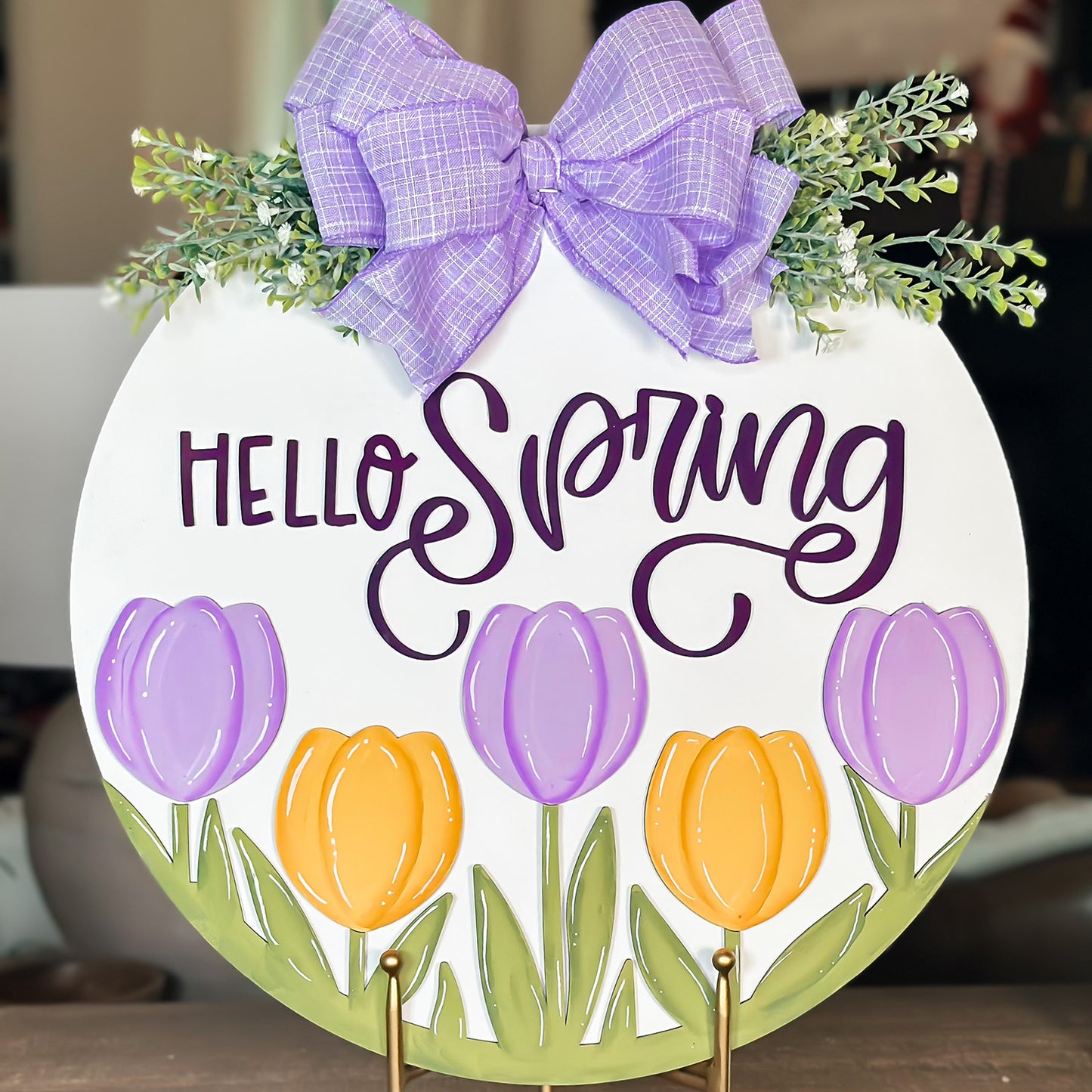 Welcome the season with this cheerful "Hello Spring" round door hanger design! Featuring vibrant tulips and elegant script lettering, this Glowforge-friendly file is perfect for creating stunning wood signs for home decor, gifts, or boutique sales.