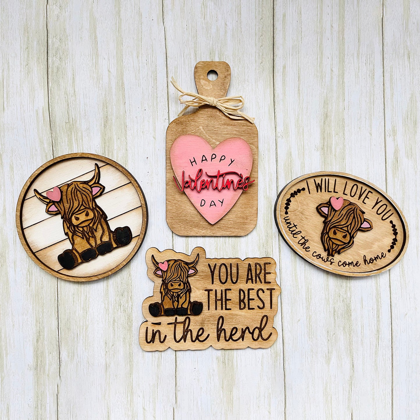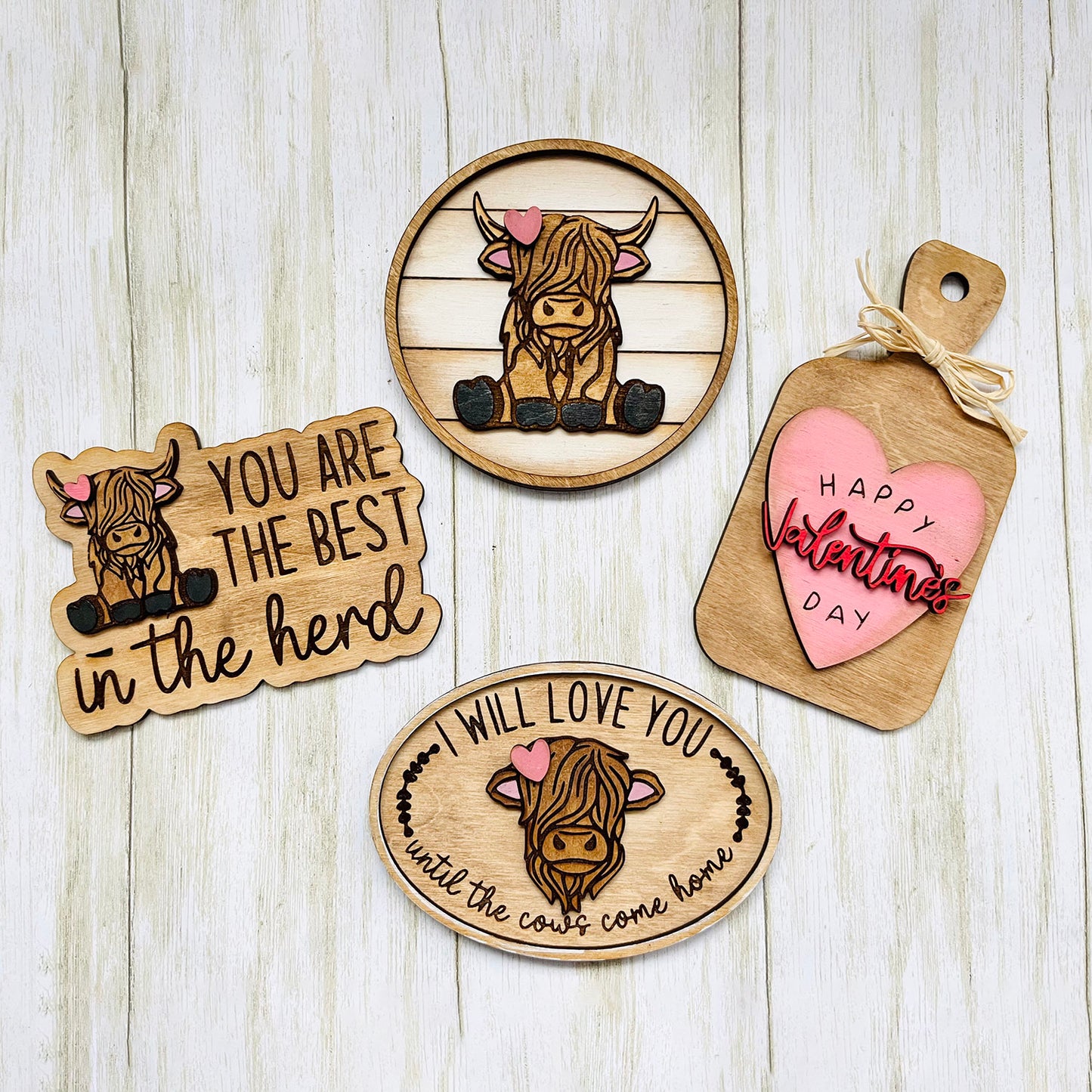 Decorate your home for Valentine's Day with this super cute cow set. This charming Highland Cow Valentine's Tiered Tray Set includes four farm-chic items that will add a touch of romance and whimsy to your Valentine's Day decor. Size and paint it to how you would like.