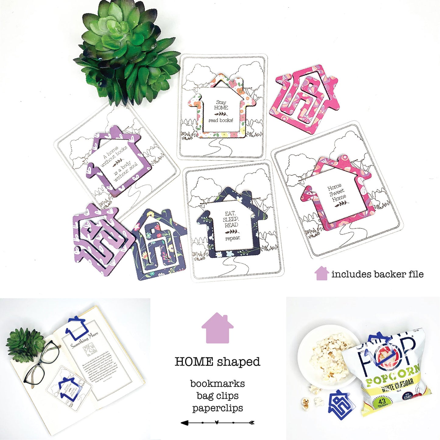 Home-shaped bookmark laser cut file. These are great book-lover gifts. Includes a backer file that can be scored and cut on the laser on poster board using the 20lb copy paper Glowforge setting. These make great scrap busters! Slide them into a self-sealing cellophane bag and you've got a great little add-on product that sells great at markets, bookstores, or promo gift. To create a patterned look, mod podge scrapbook paper to 1/8" wood, let dry, mask with low tack masking tape, and cut.