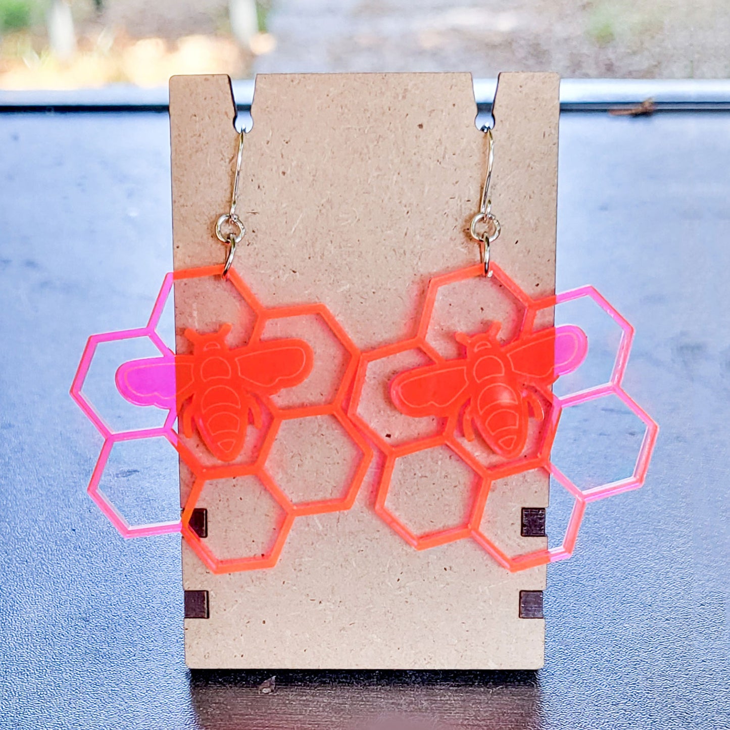 These honey bee dangles feature a bee over a honeycomb. The features can be adjusted from laser cutting, engraving and score to all cuts, in order to make these already lightweight earrings even lighter.