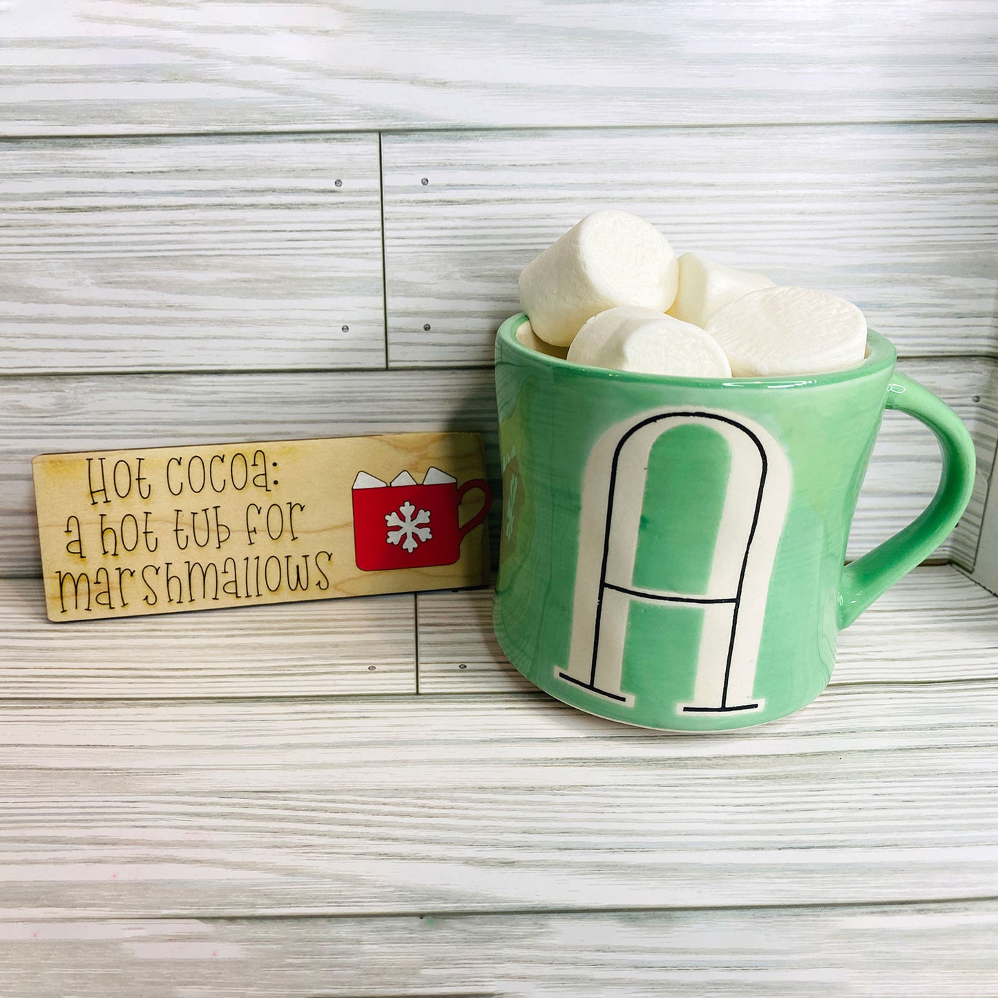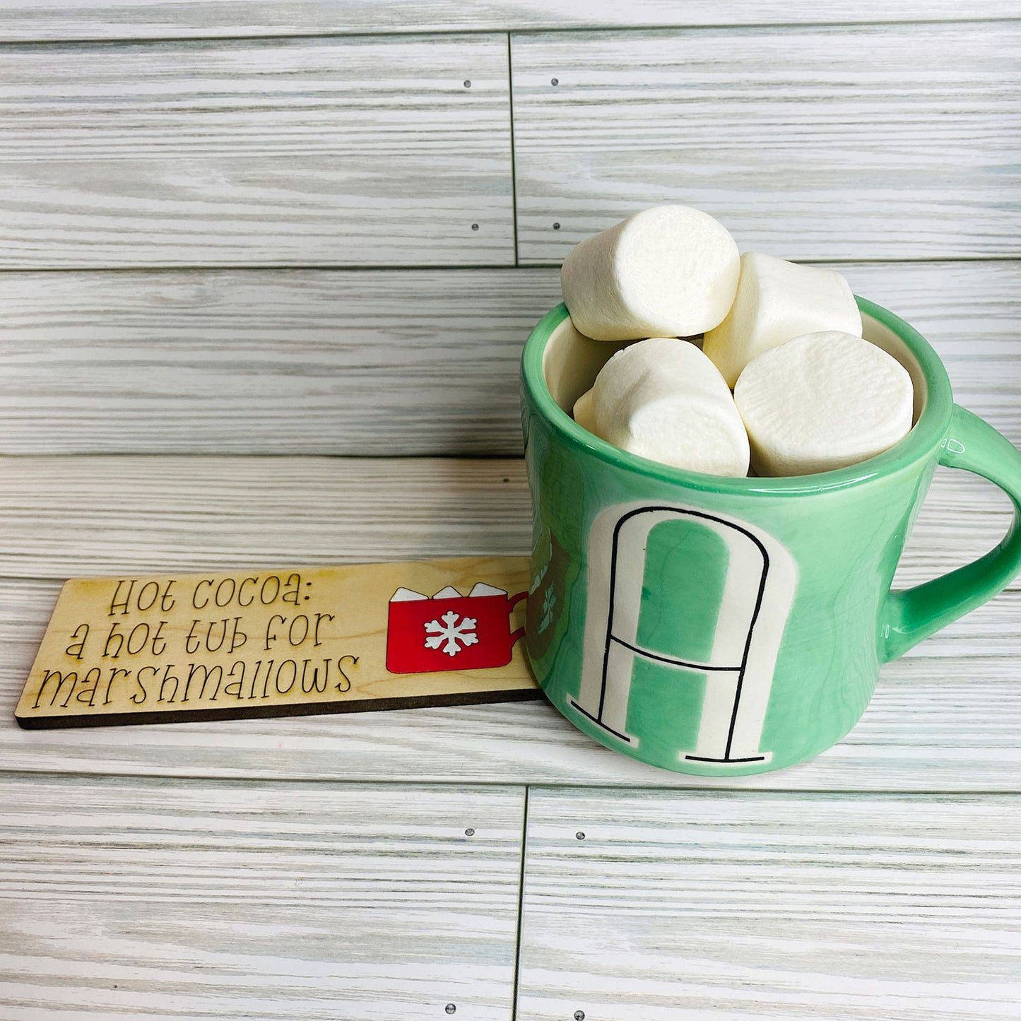 Add this adorable laser cut sign to your coffee/cocoa/tea bar to decorate for the holidays. This can also be a shelf sitter to decorate a mantle. Make this larger and hang it on the walls, the possibilities are endless! Paint the scored cocoa mug or leave it natural, whatever you like the best. The score lines make painting easy for beginners. Make this season cozy. Extremely quick print, easy to make a bunch for laser cutting craft shows.
